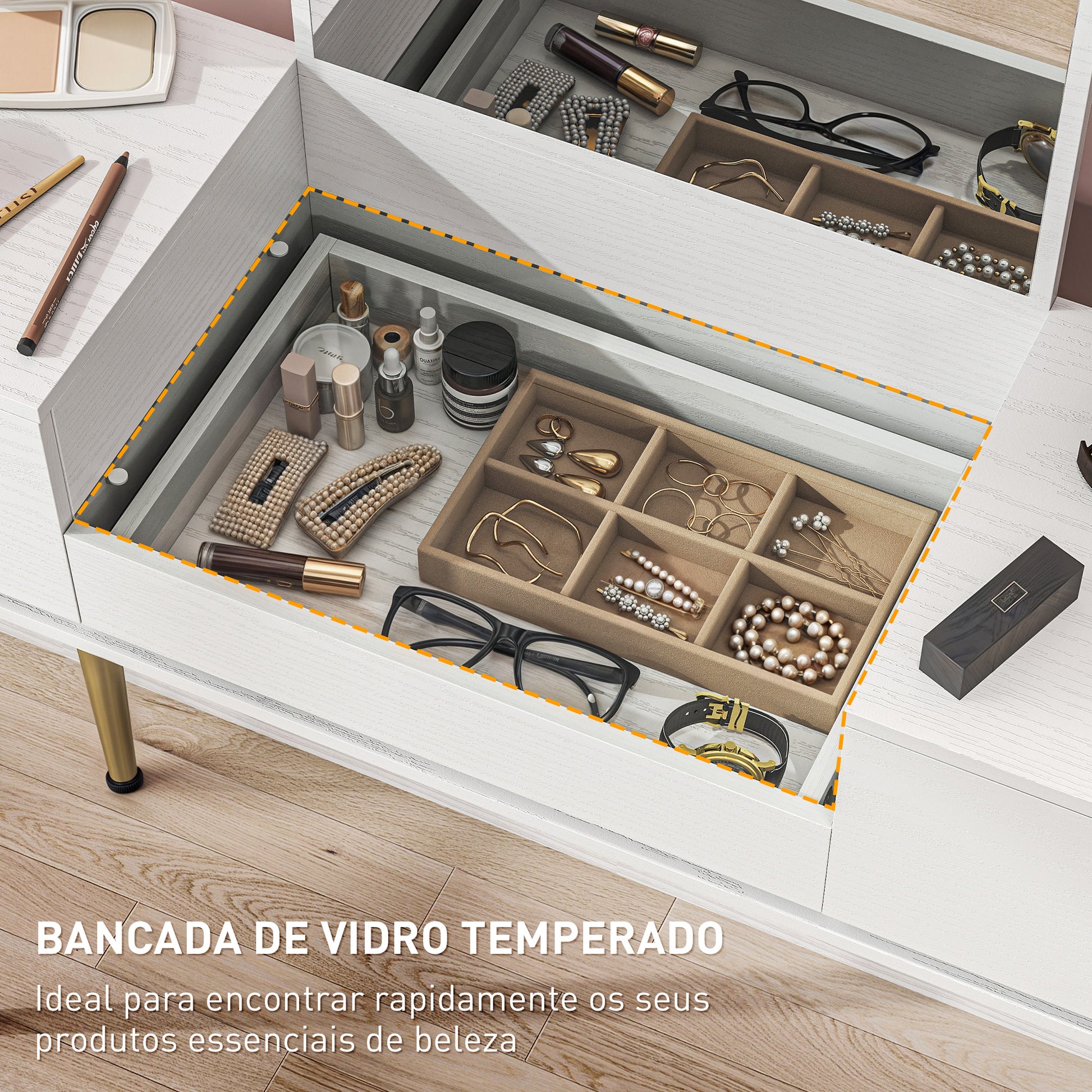 Comece o dia com estilo com este Tocador de Maquilhagem branco, que combina design moderno e funcionalidade. Fabricado em madeira branca com pés dourados, este toucador oferece uma superfície de vidro temperado para facilitar a visualização dos seus itens essenciais.