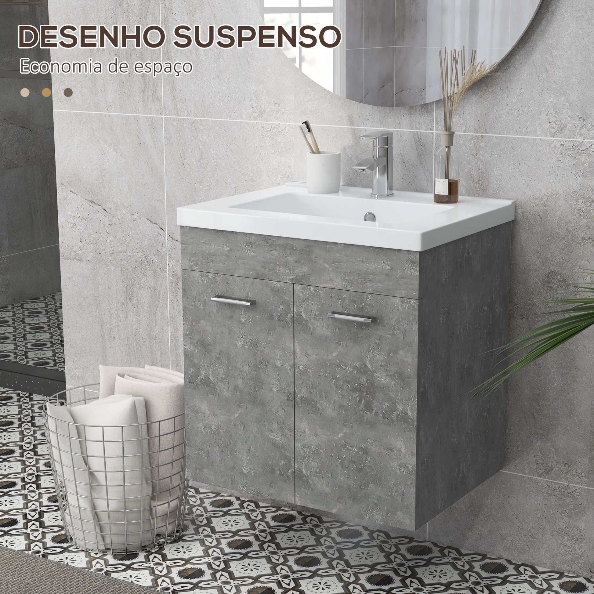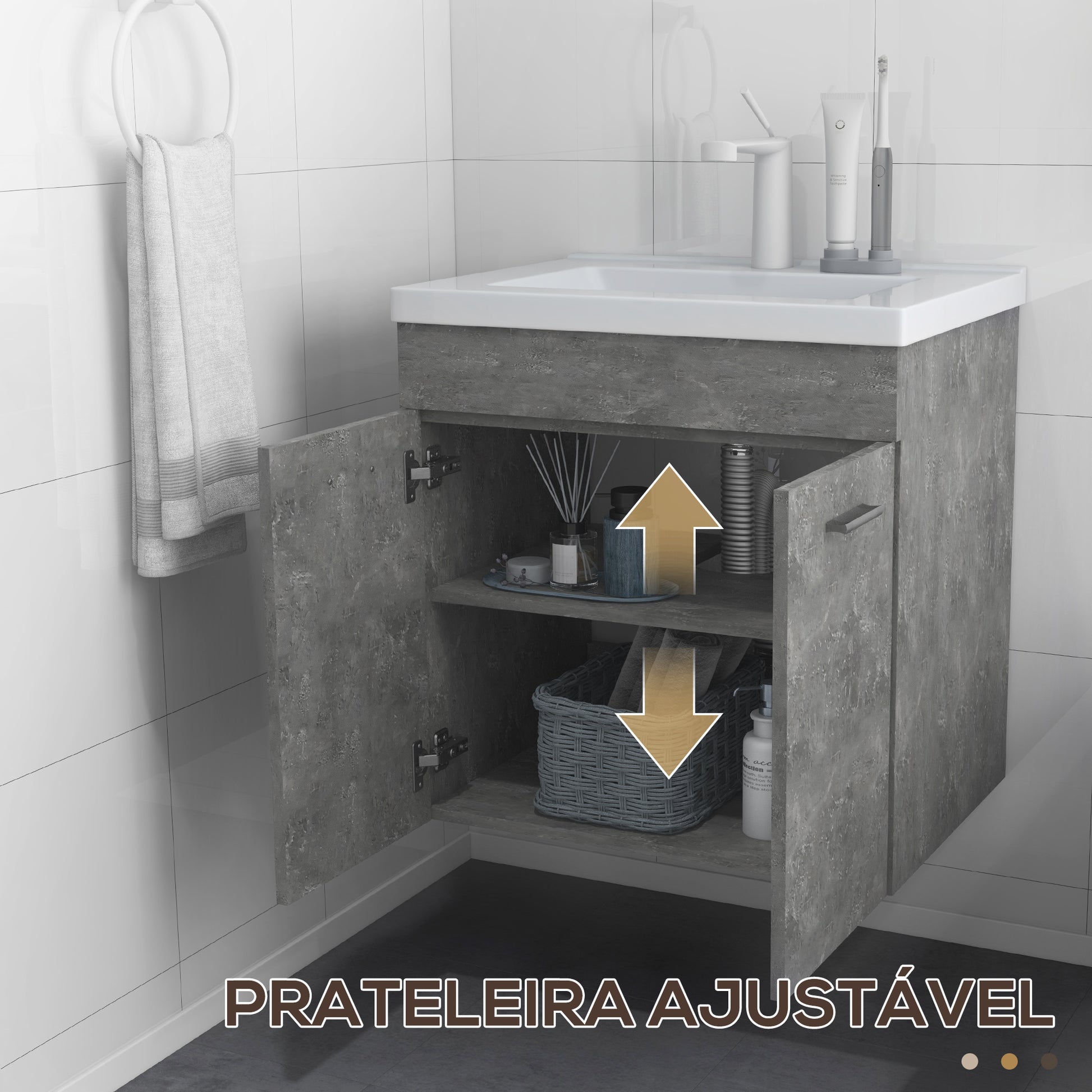 Transforme a sua casa de banho com este móvel suspenso em cinzento elegante e funcional, com lavatório cerâmico embutido e prateleira ajustável.