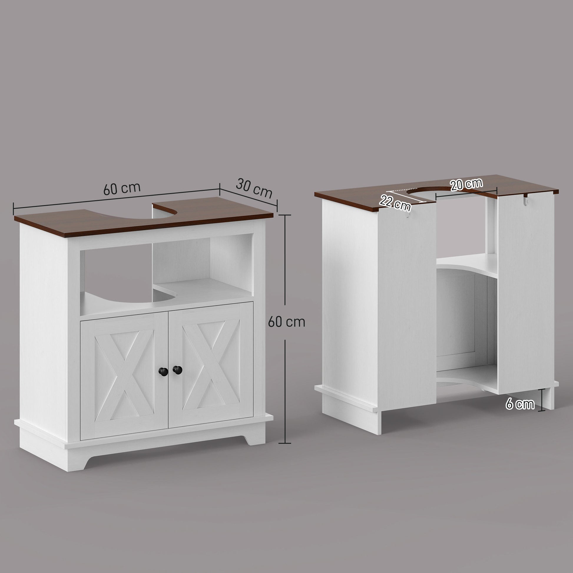 - Benefícios: Proporciona espaço extra de armazenamento, prateleira aberta, armário com duas portas, design campestre elegante