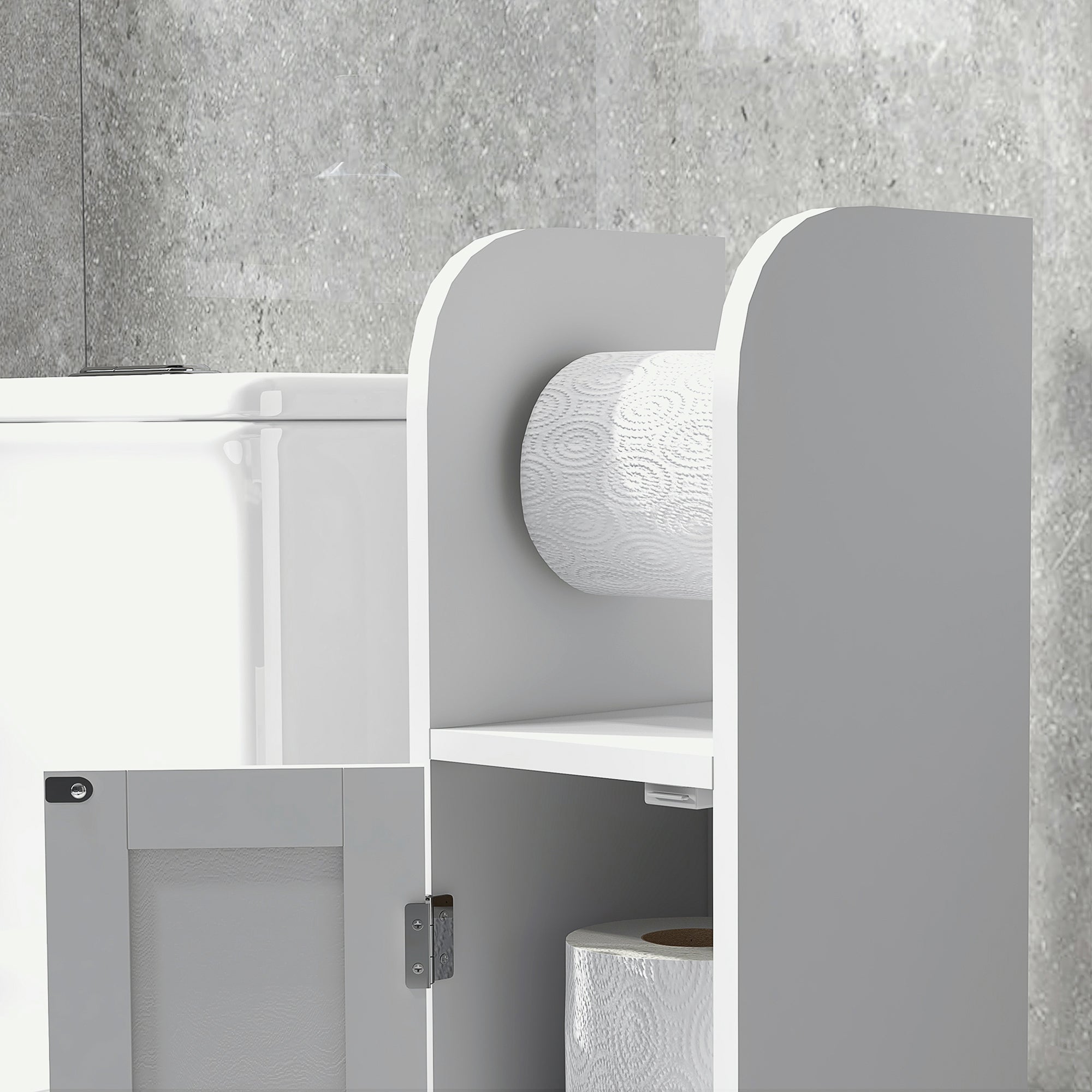 Este armário de casa de banho branco é ideal para armazenar papel higiénico, com prateleiras ajustáveis e suporte para papel higiénico. Personalize o seu espaço com duas prateleiras interiores reguláveis em altura em 3 posições diferentes, adaptando o espaço dos 3 compartimentos às suas necessidades.