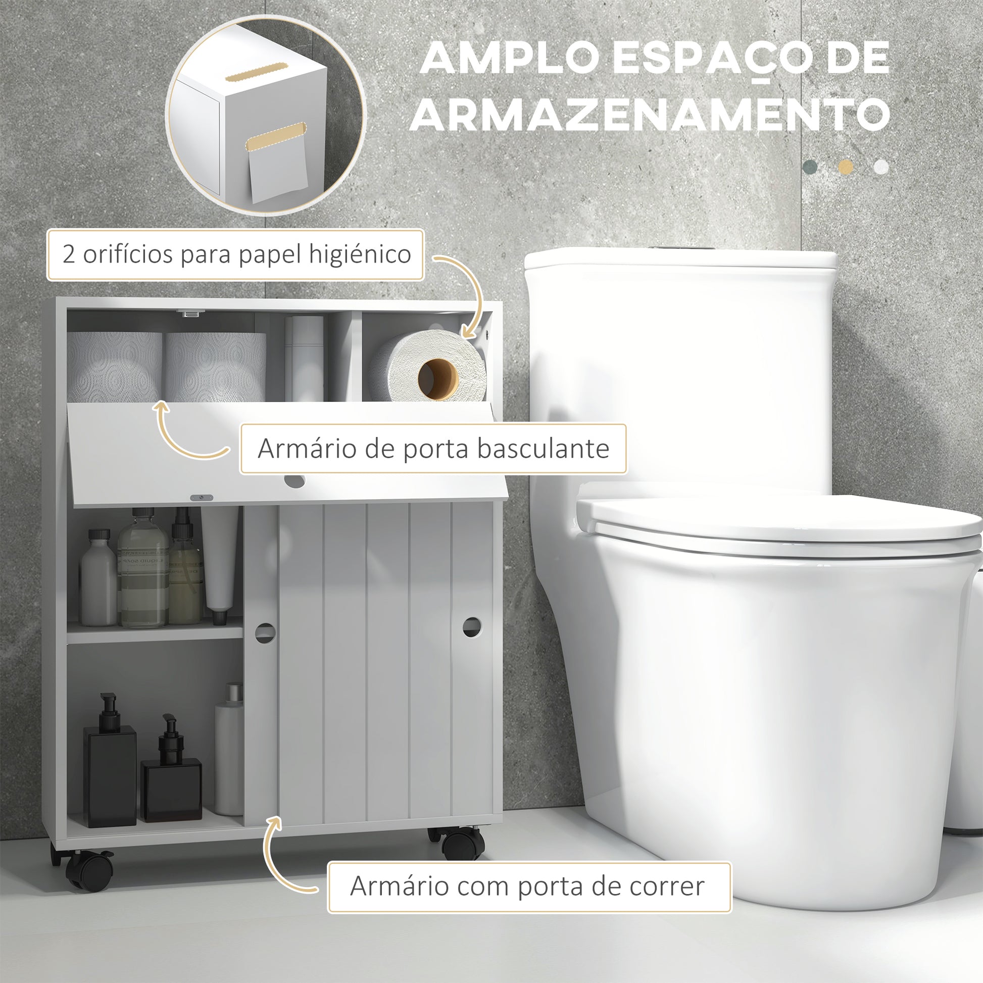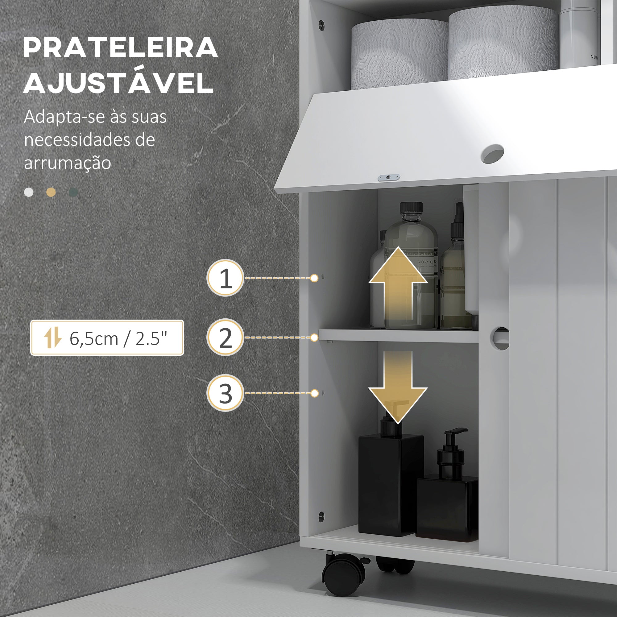 - Benefícios: Inclui um armário superior com porta rebatível, dois compartimentos para papel higiénico, armário inferior com duas portas deslizantes, prateleira ajustável e quatro rodas para facilitar a movimentação.