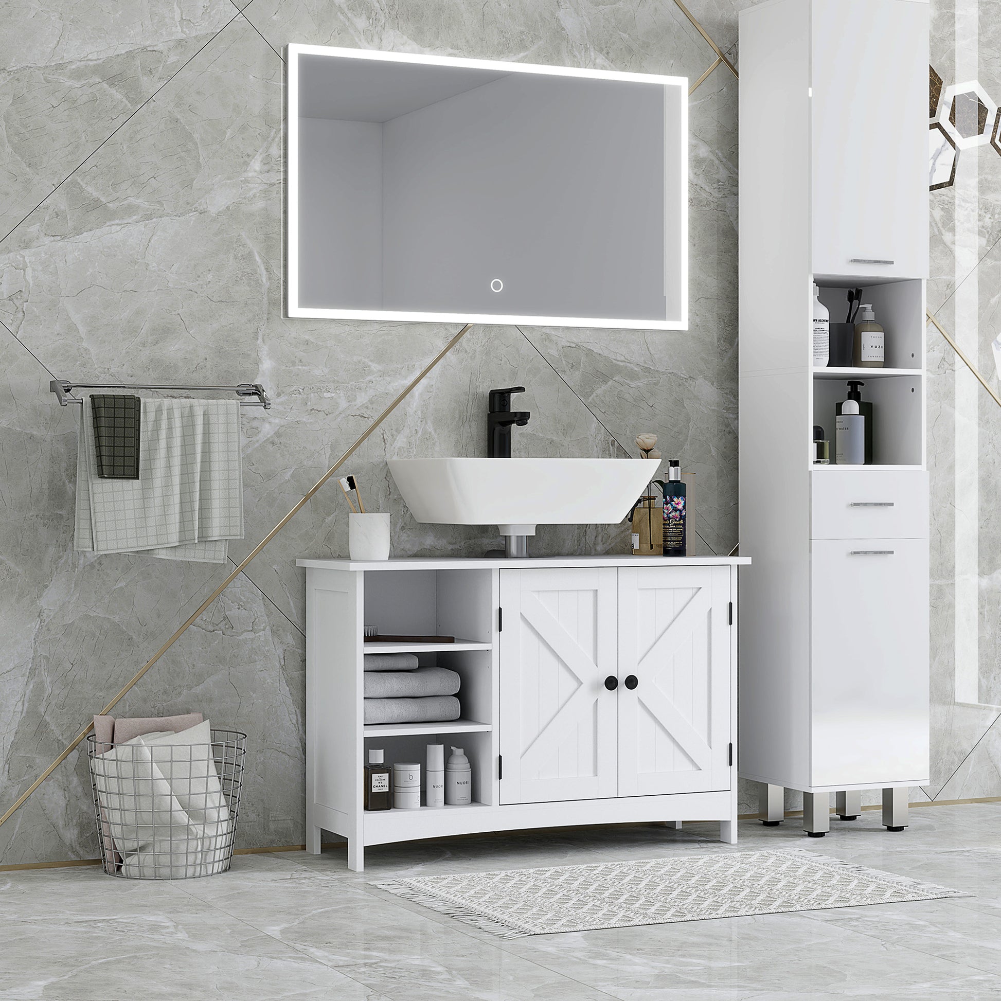 - Benefícios: Entalhe em forma de U para encaixar sob a pia; design rústico com desenho em forma de X na porta; superfície envernizada fácil de limpar