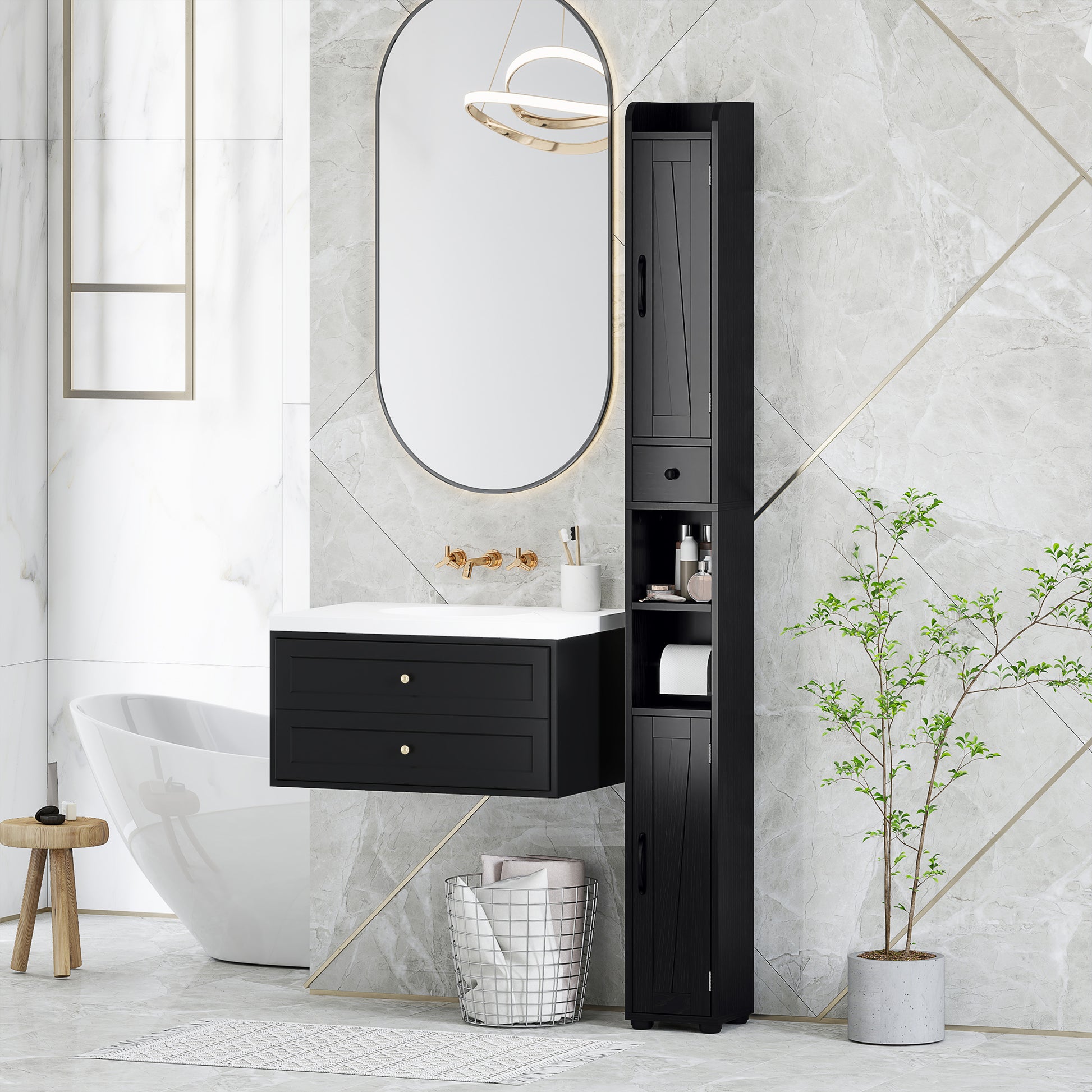 Organize a sua casa de banho de forma eficiente com esta coluna de casa de banho rústica em preto, com medidas de 20x20x185 cm. Inclui dois armários com portas, uma gaveta prática, dois compartimentos abertos, prateleiras ajustáveis e suporte para papel higiénico.