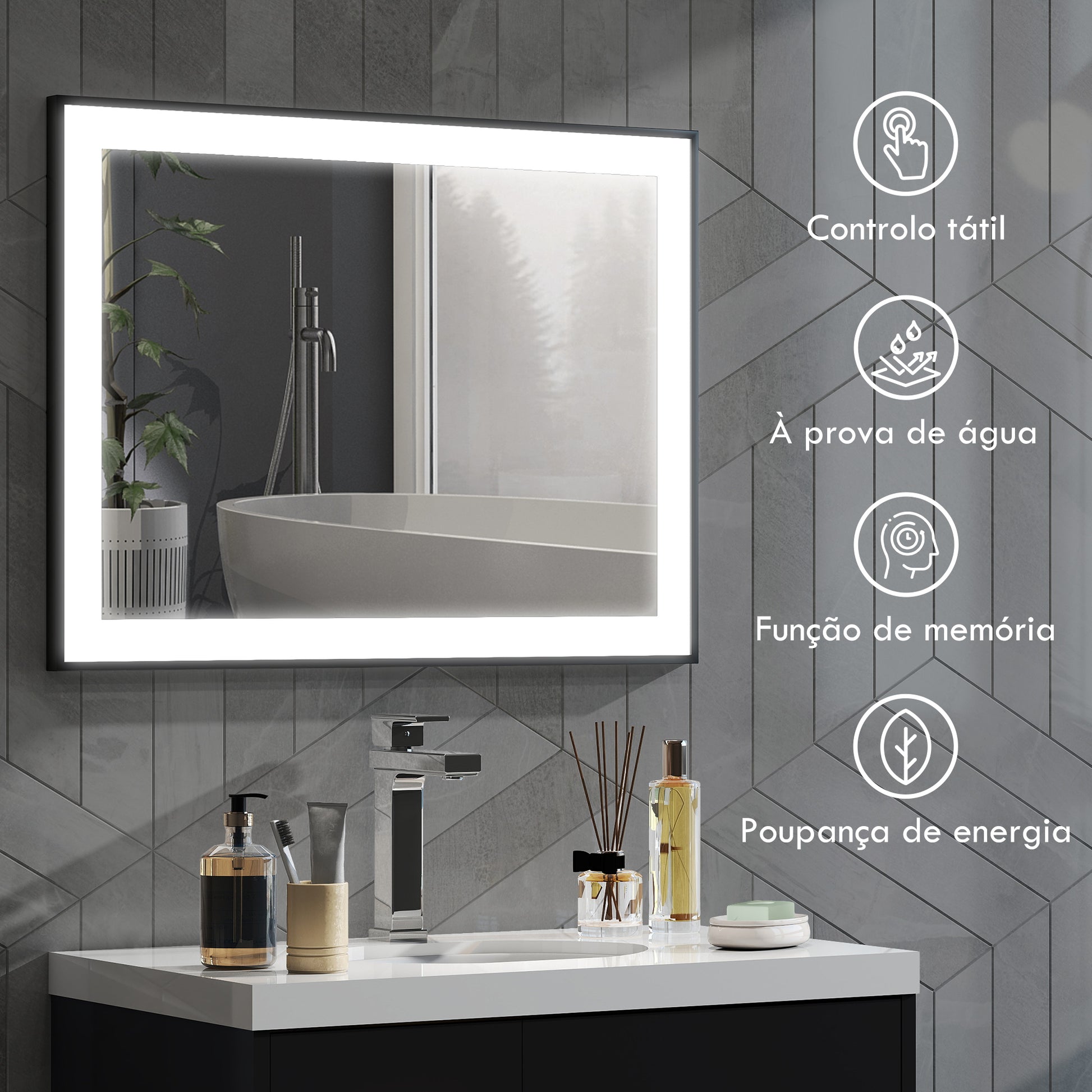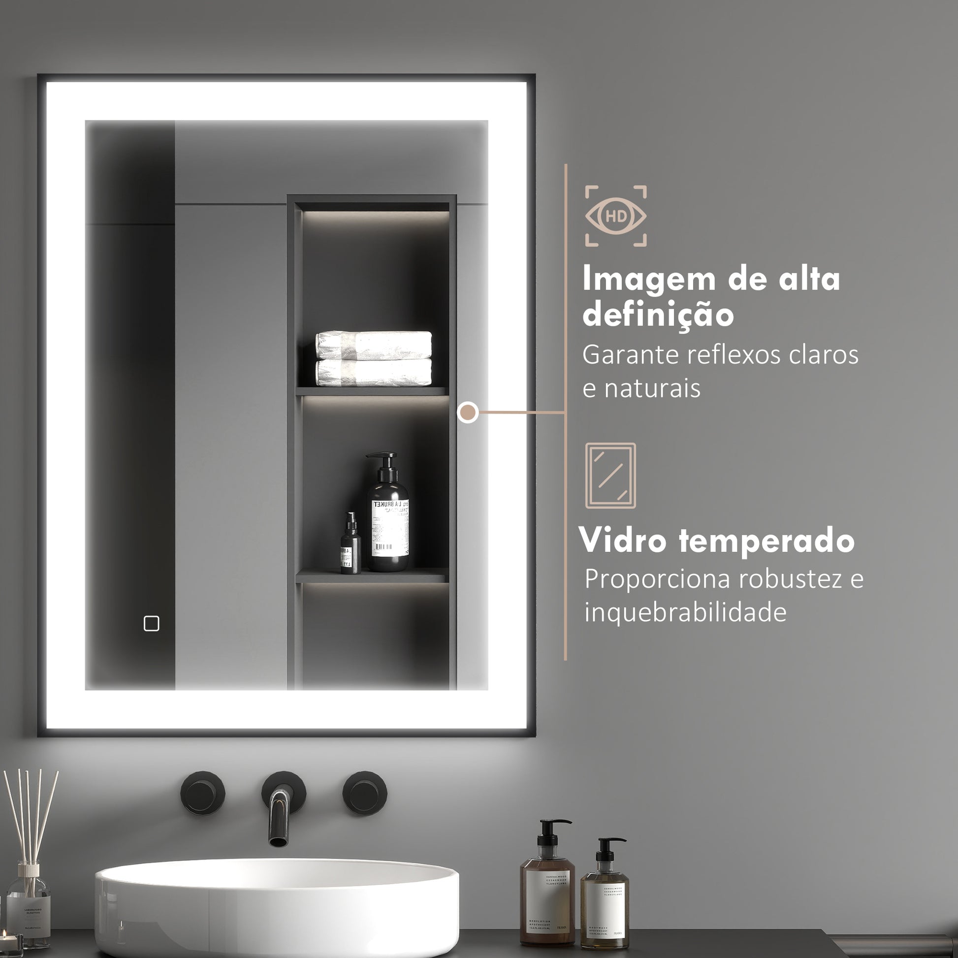Ilumine a sua casa de banho com estilo e funcionalidade com este espelho de parede LED, na cor preto, medindo 80x60 cm.