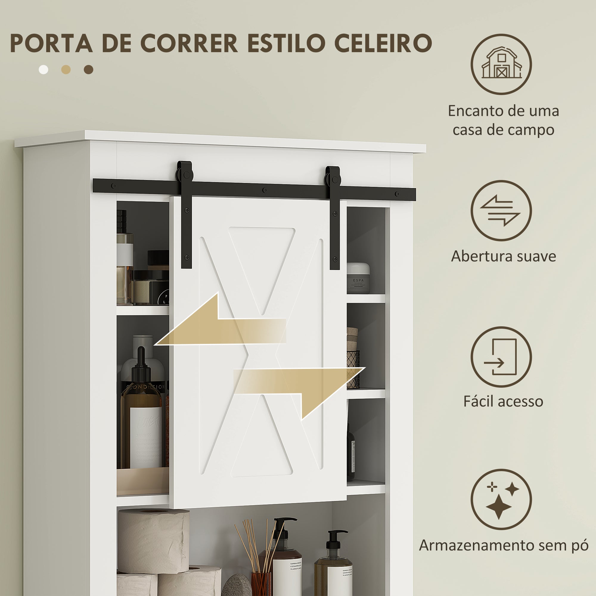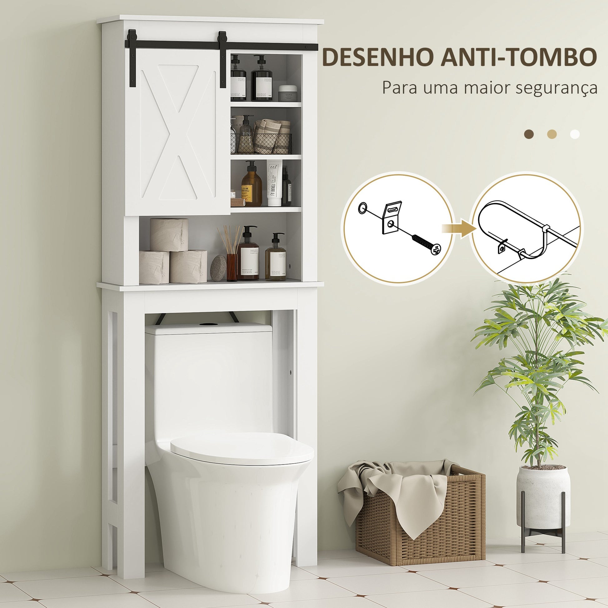 Maximize o espaço da sua casa de banho com este elegante móvel sobre sanita em branco. Com uma porta de correr estilo celeiro, este móvel oferece armazenamento prático e organizado para manter a sua casa de banho livre de desordem.