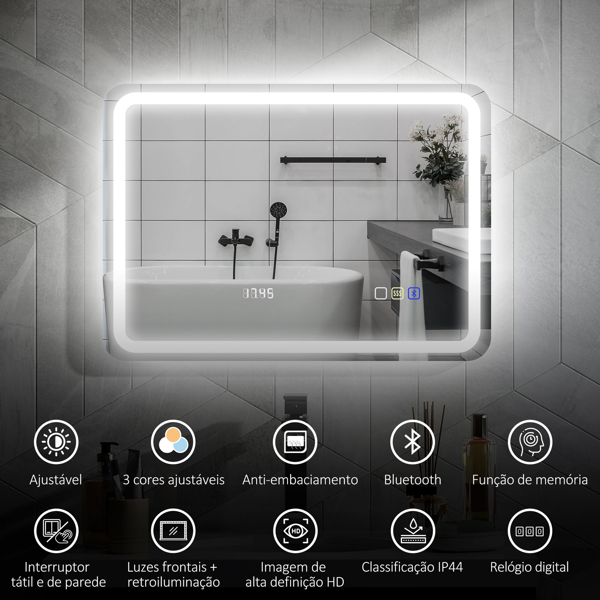 - Benefícios: Iluminação LED ajustável em cor e brilho, função antiembaciamento, conectividade Bluetooth, relógio digital integrado