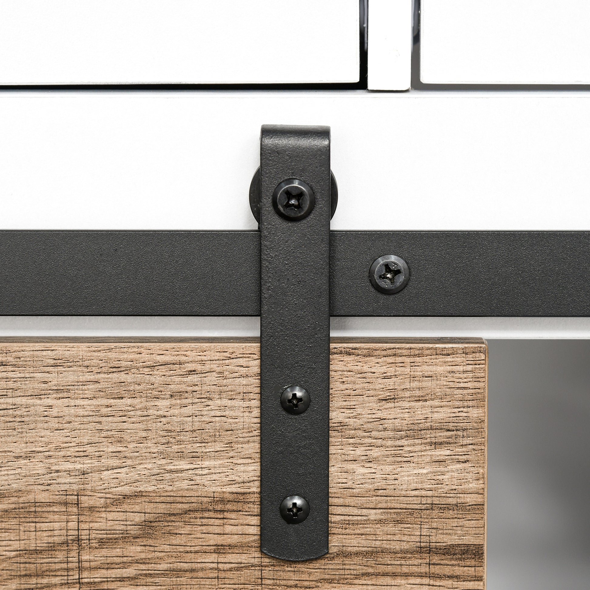 Este incrível móvel de cozinha combina o estilo rústico com um toque moderno, apresentando uma porta de celeiro deslizante e detalhes em ferragens negras que o tornam uma peça única e acolhedora para qualquer espaço.