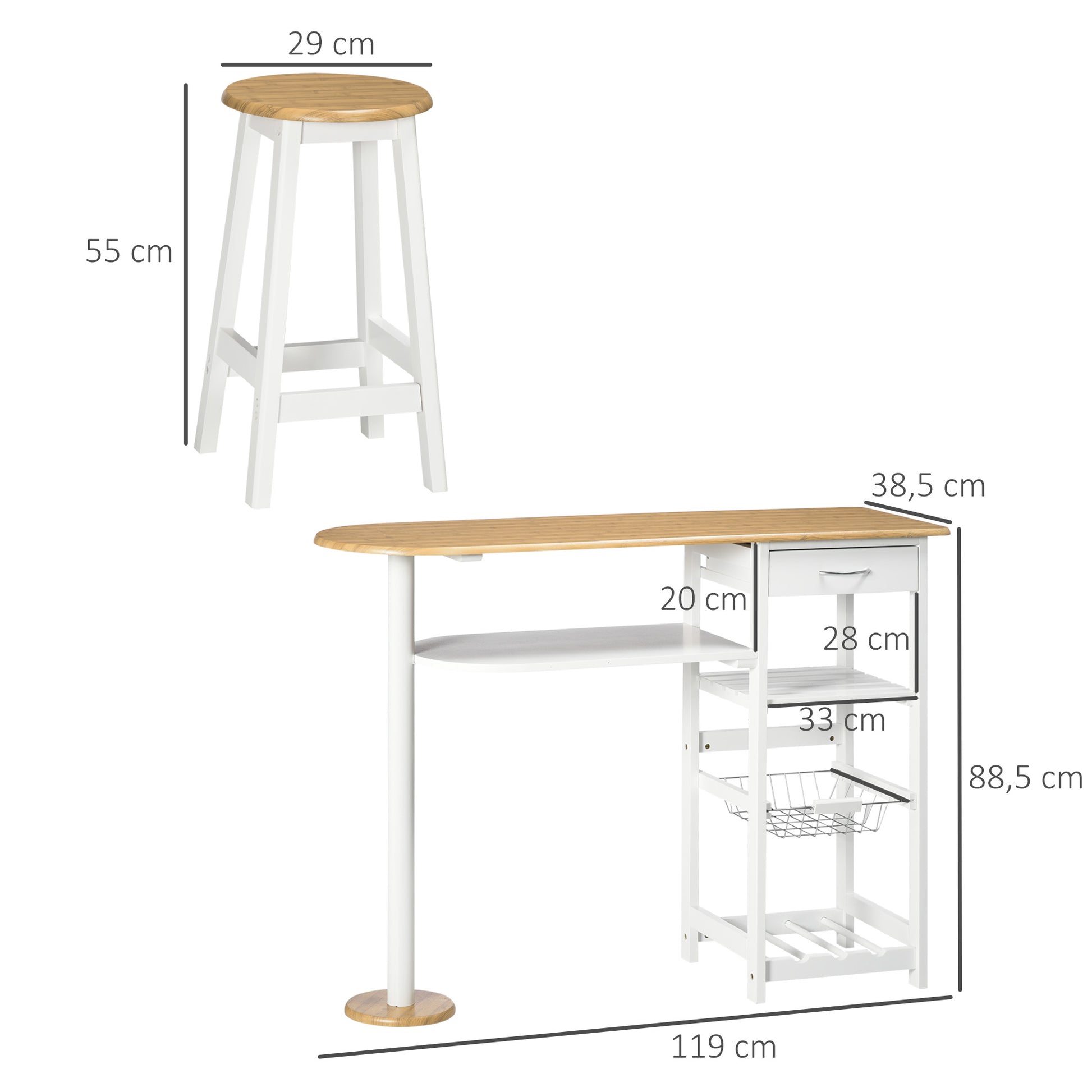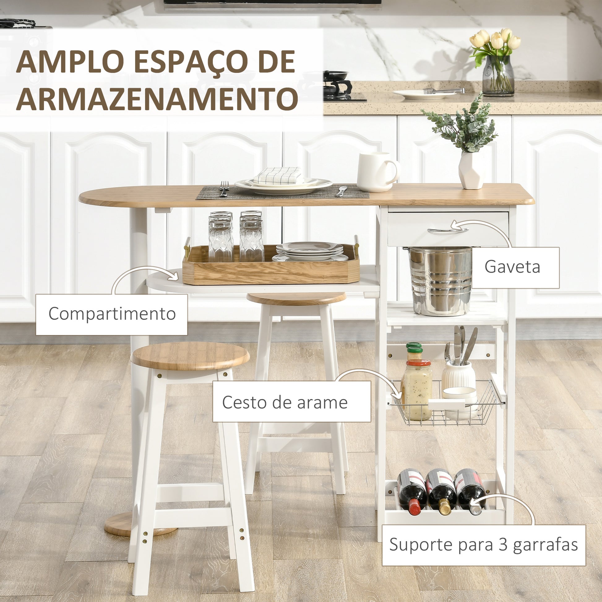 - Benefícios: Amplo espaço de armazenamento com 2 prateleiras, 1 gaveta, 1 cesto removível e suporte para garrafas. Bancos sem encosto que podem ser armazenados embaixo da mesa.