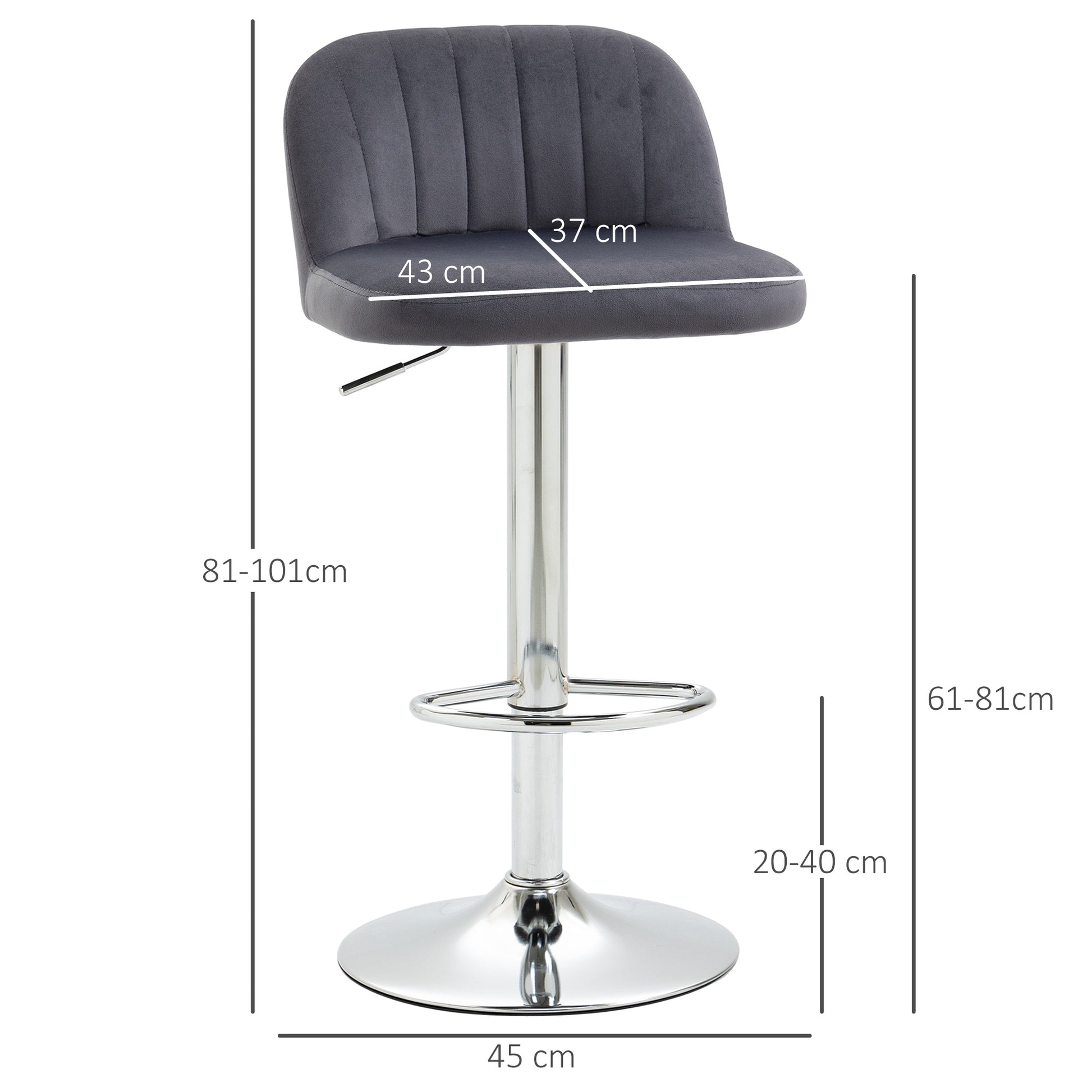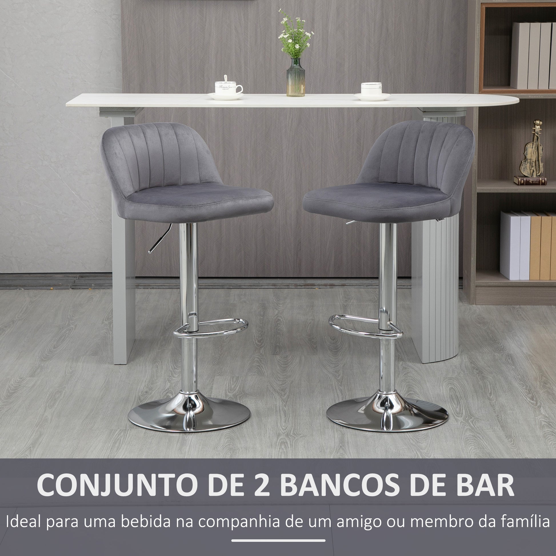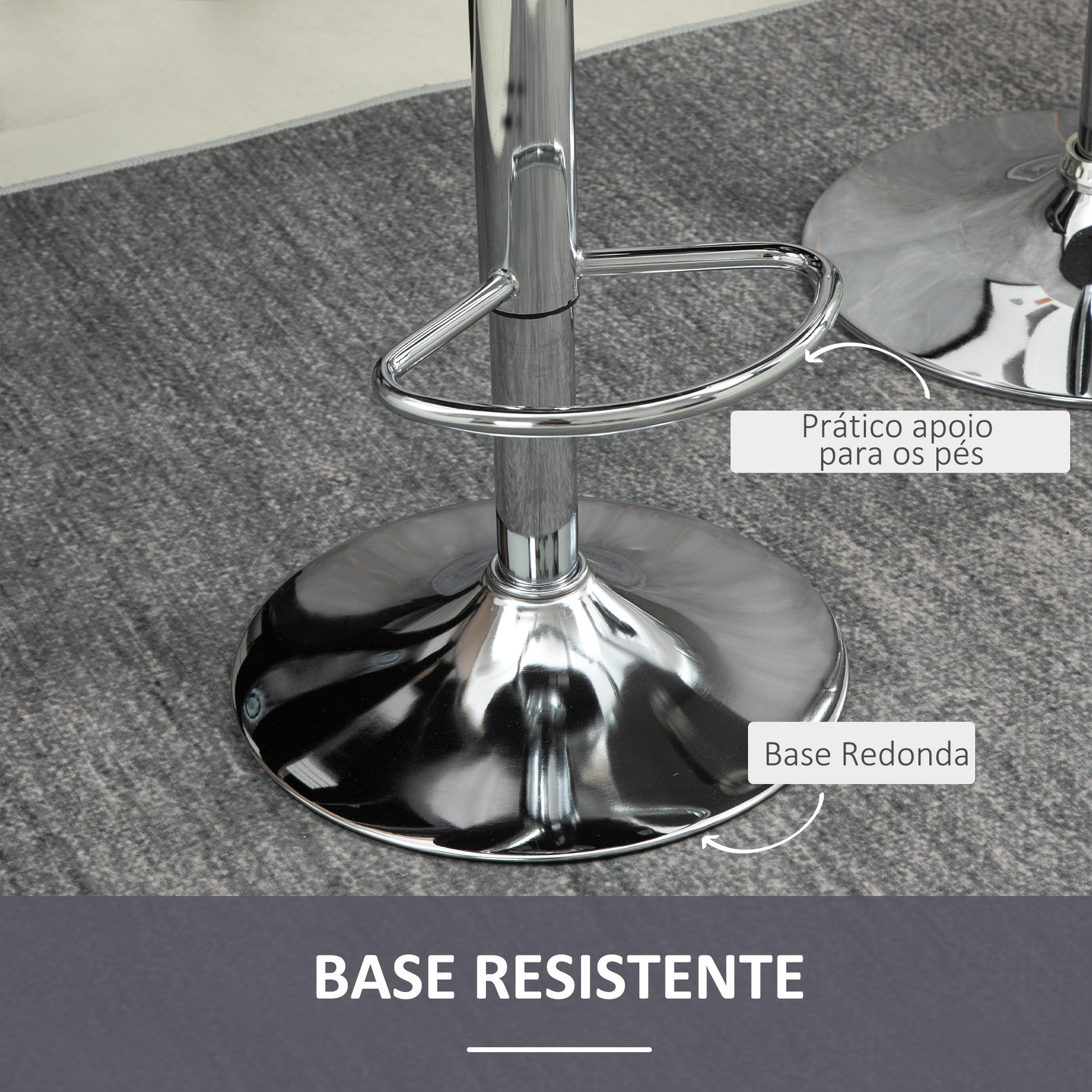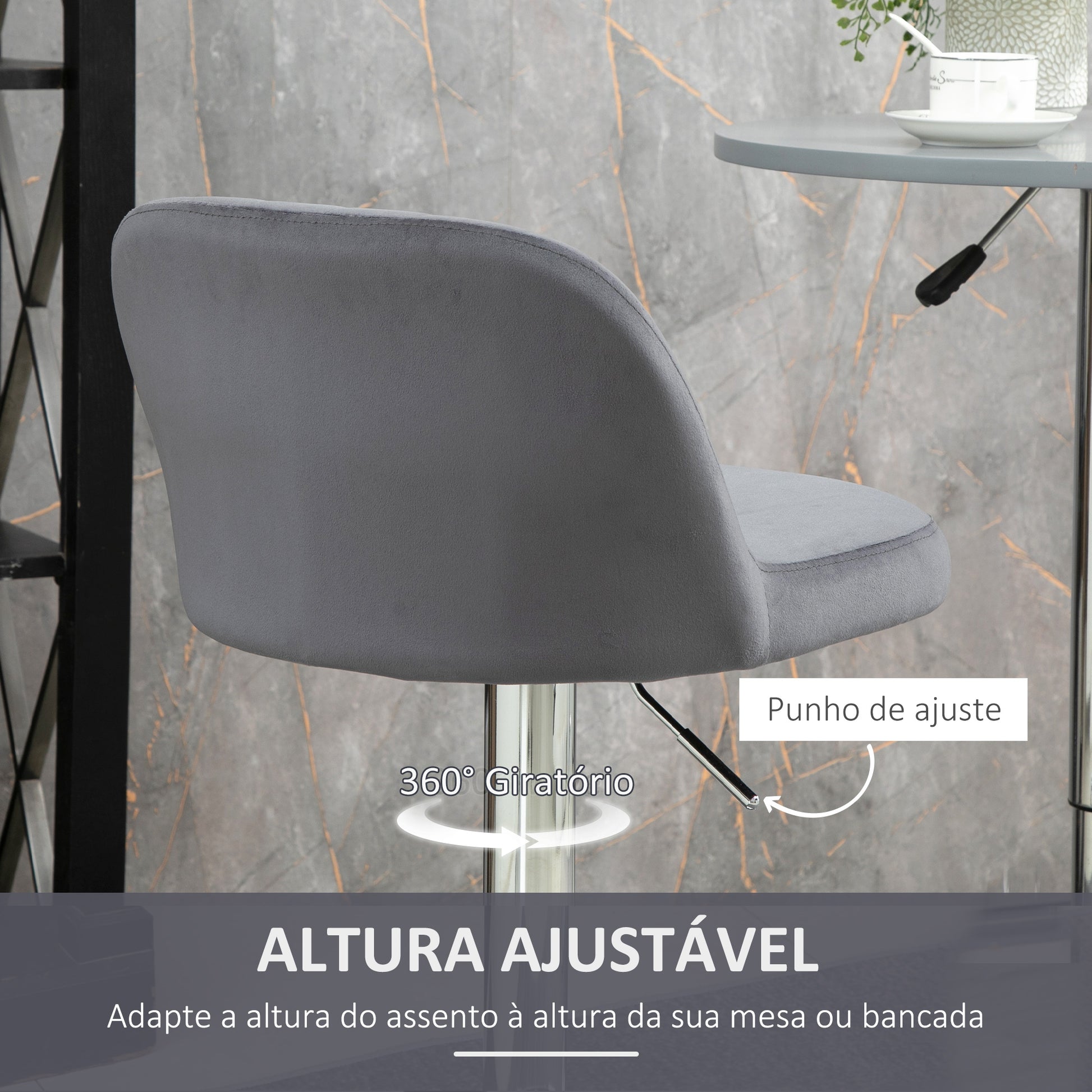 - Benefícios: Assento acolchoado em espuma, estofado em tecido de veludo, altura ajustável entre 61-81cm, assento giratório 360°, apoio para os pés para maior conforto