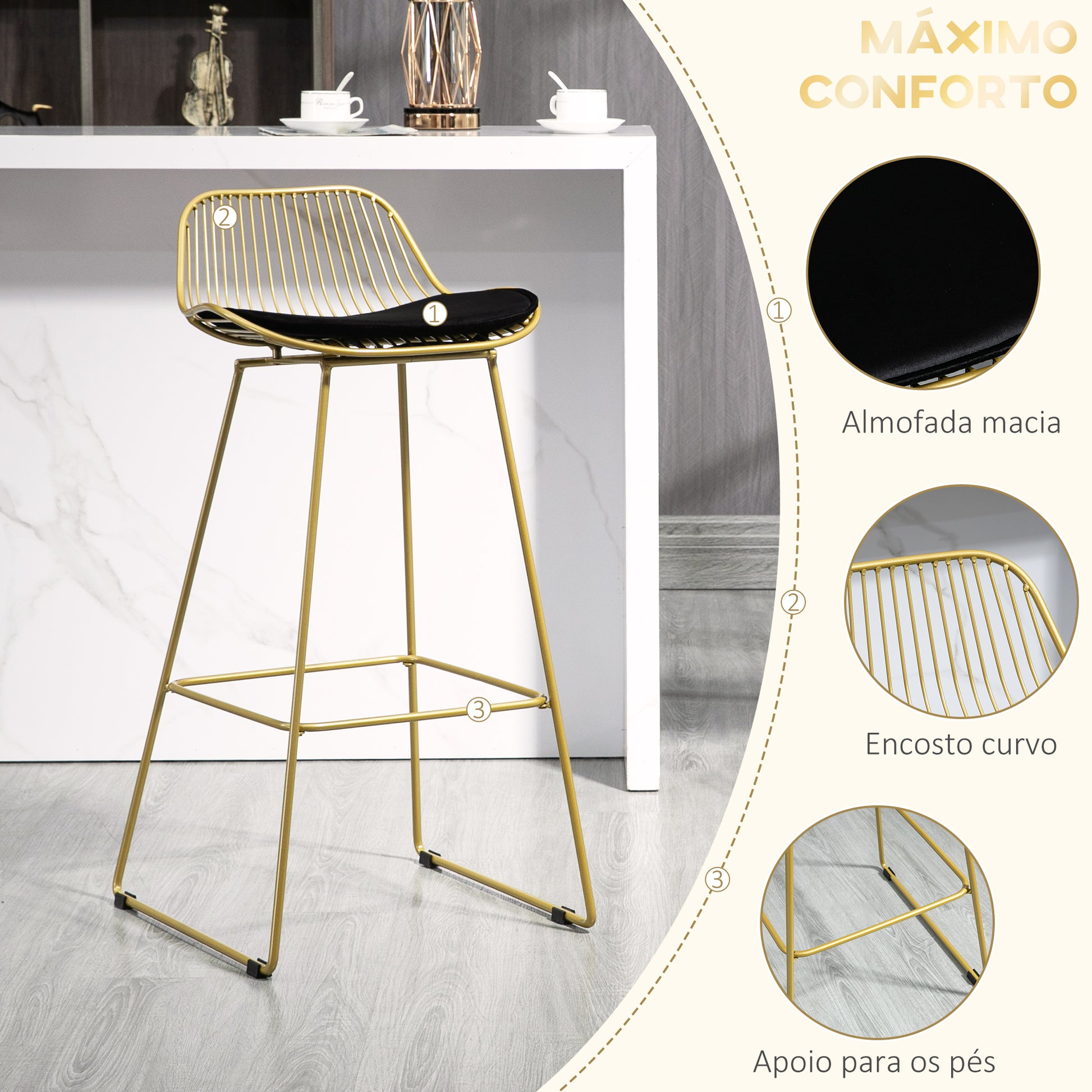 Aproveite a elegância e o luxo deste conjunto que se destaca pelo design em fios de aço, combinando as cores dourado e preto para um toque de sofisticação em qualquer ambiente. Monte um espaço confortável para seus convidados com estes bancos altos!
