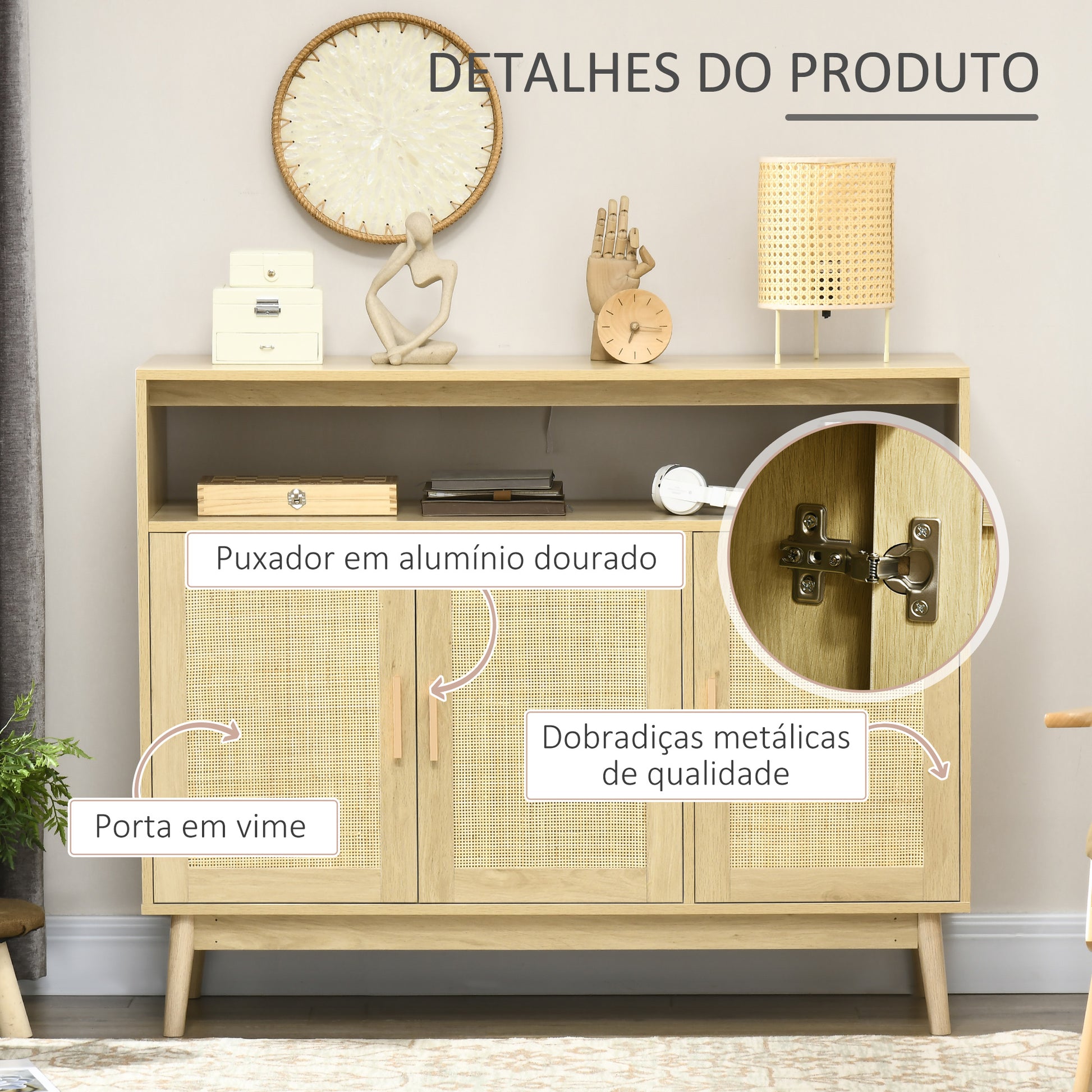Aparador de Sala de Estar – 120x40x97 cm – Cor de Madeira Natural – Melamina de madeira, vime natural e madeira de pinho