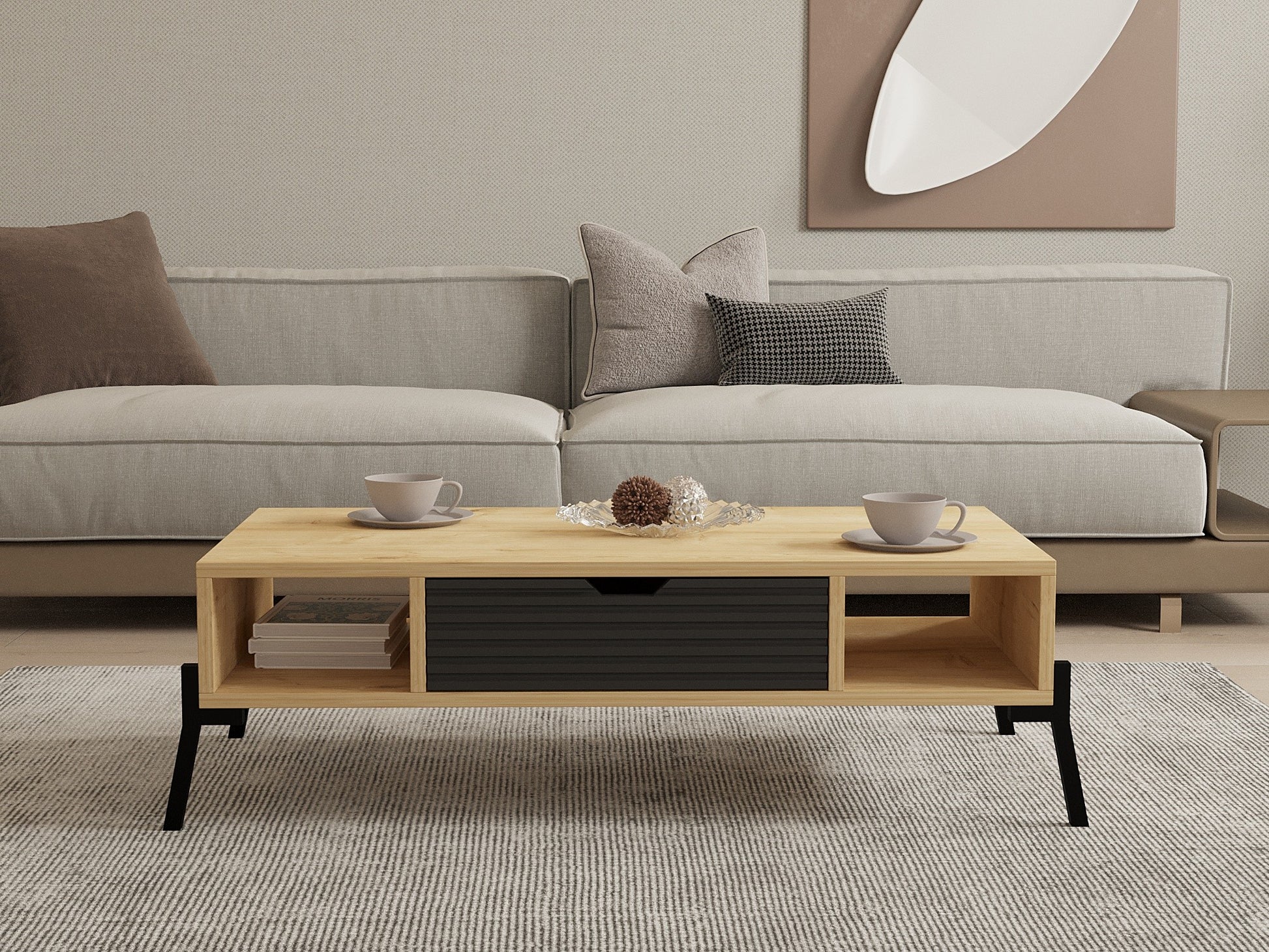 A mesa de centro é fornecida numa combinação espantosa de cores de carvalho safira e antracite, criando um contraste visualmente apelativo que acrescenta profundidade e carácter à sua sala de estar. As cores misturam-se sem esforço com qualquer decoração existente, tornando-a uma escolha versátil para todos os estilos de interiores.