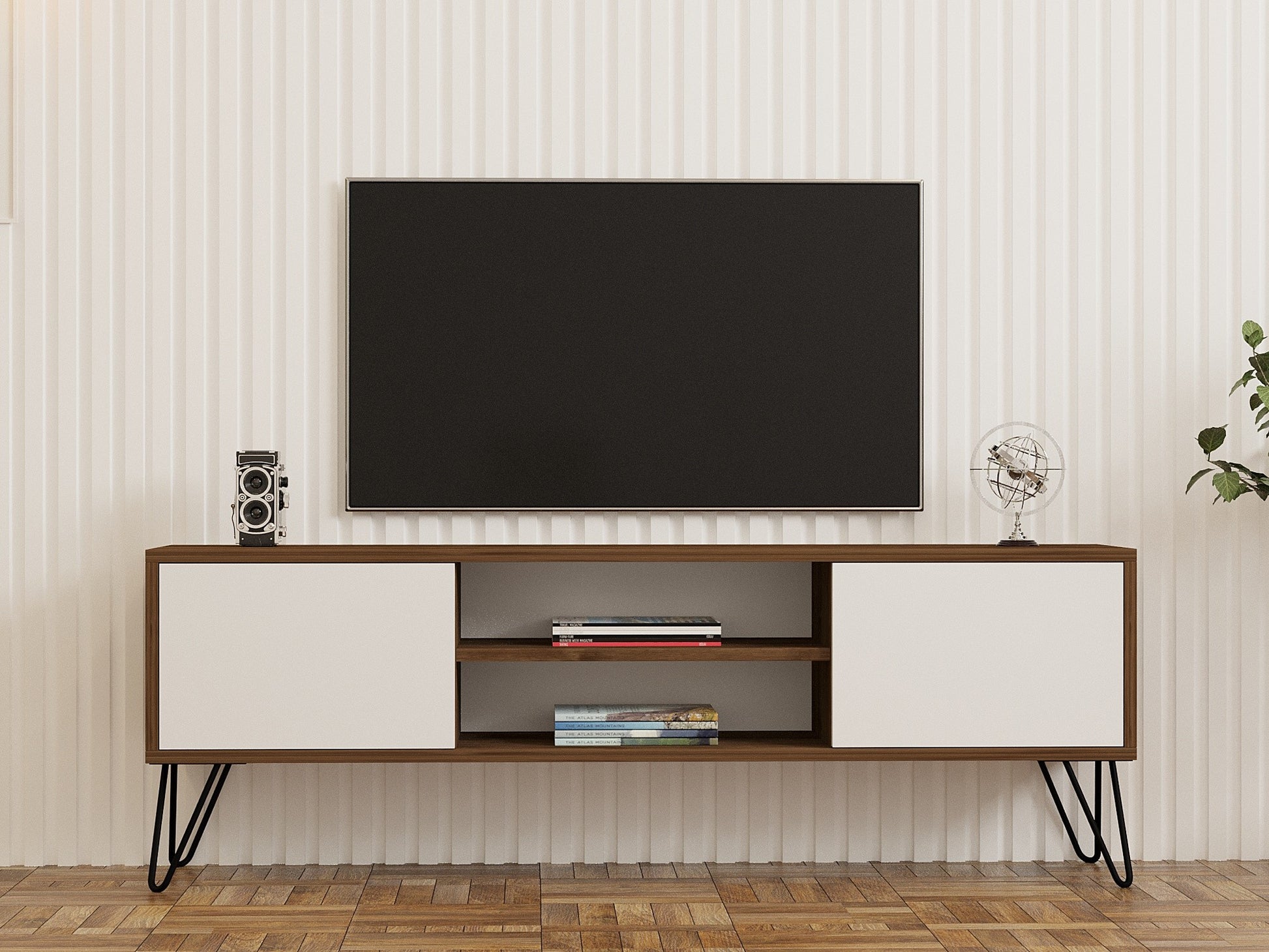 Com o seu design elegante e apelo moderno, este suporte para televisor elevará sem esforço a estética da sua sala de estar. A combinação das cores nogueira e branco acrescenta um toque de elegância, tornando-o um complemento perfeito para qualquer decoração de casa.