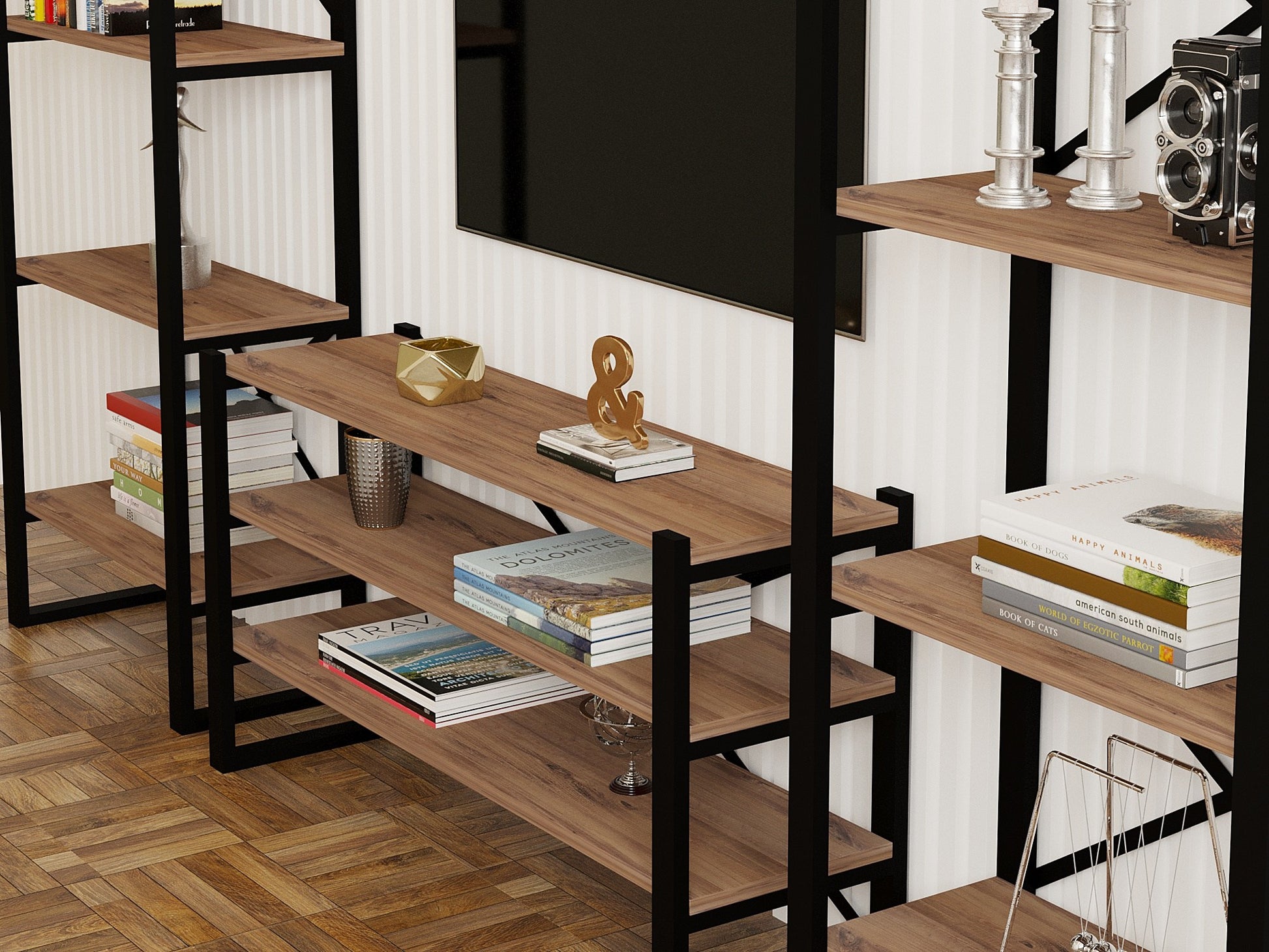 O móvel para televisor apresenta um design elegante com um tampo espaçoso para o televisor e prateleiras adicionais para os dispositivos multimédia. A estante acrescenta um toque de sofisticação à unidade, proporcionando uma ampla arrumação para os seus livros, decoração e muito mais.