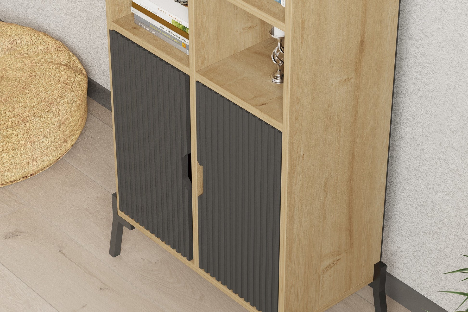 Fabricada com painéis de partículas 100% revestidos a melamina, esta estante foi concebida para durar. A espessura de 18 mm garante robustez e estabilidade, permitindo-lhe expor os seus livros e objectos decorativos com confiança. A porta com revestimento de membrana em mdf acrescenta um toque de sofisticação, enquanto as pernas de ferro proporcionam um aspeto elegante e industrial.