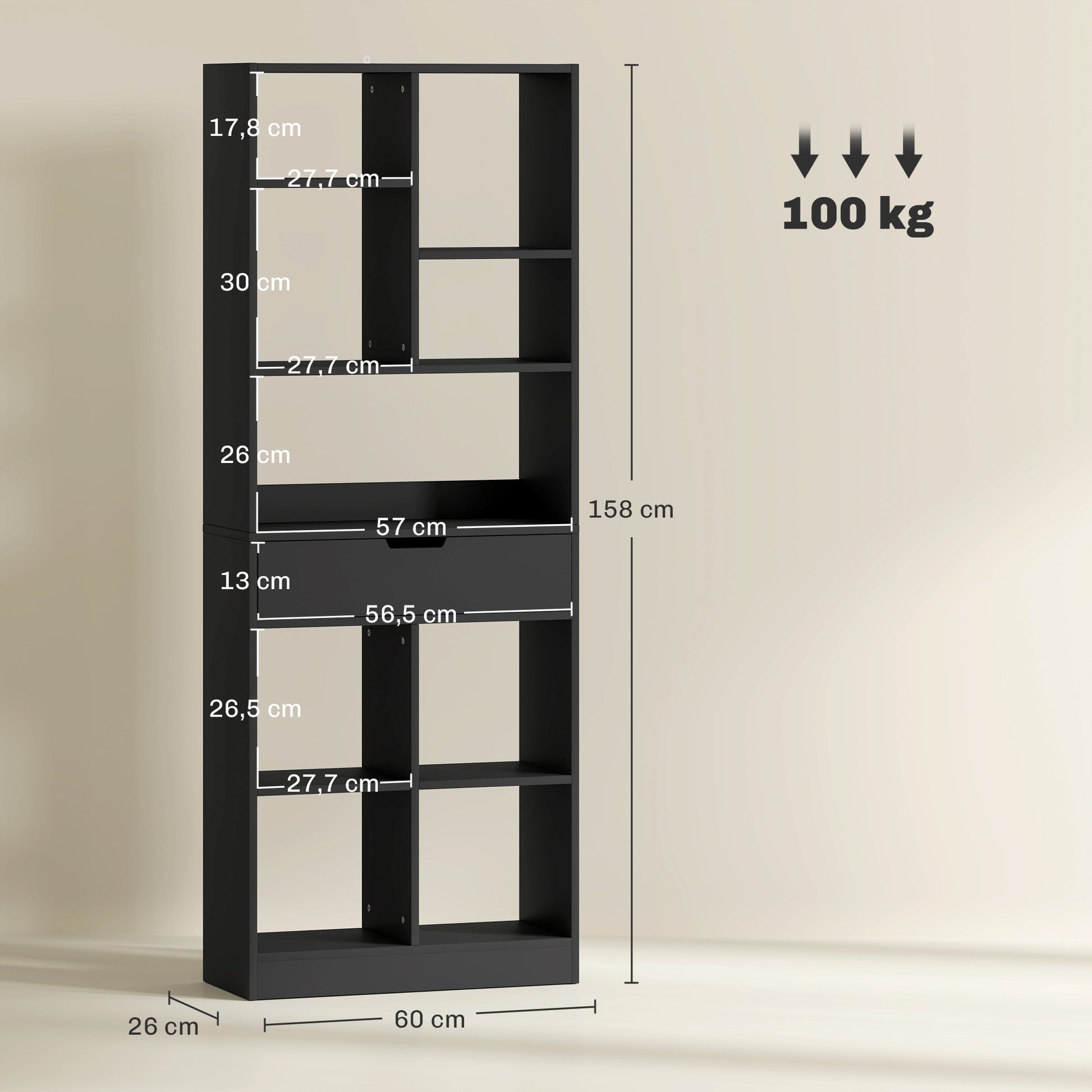 Estante de Madeira com 1 Gaveta e 9 Compartimentos de Armazenamento – 60x26x158 cm – Cor Preto – MDF