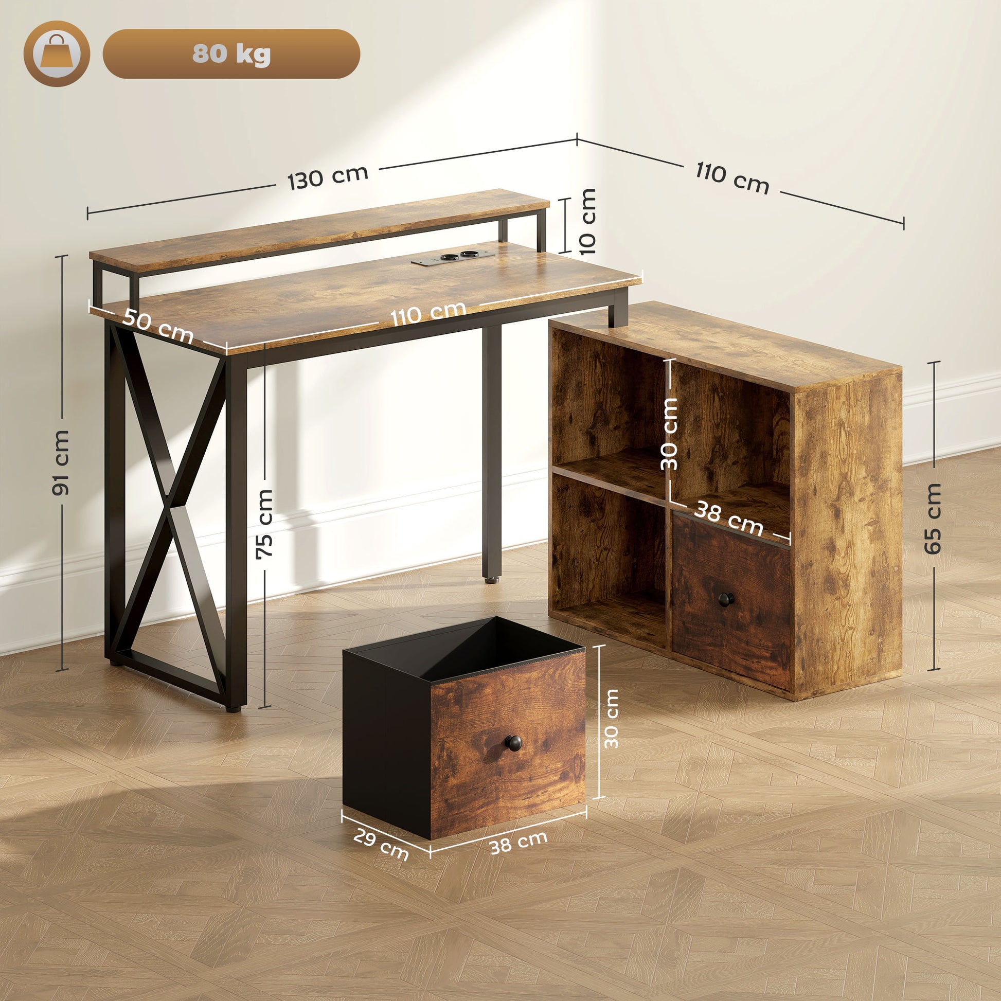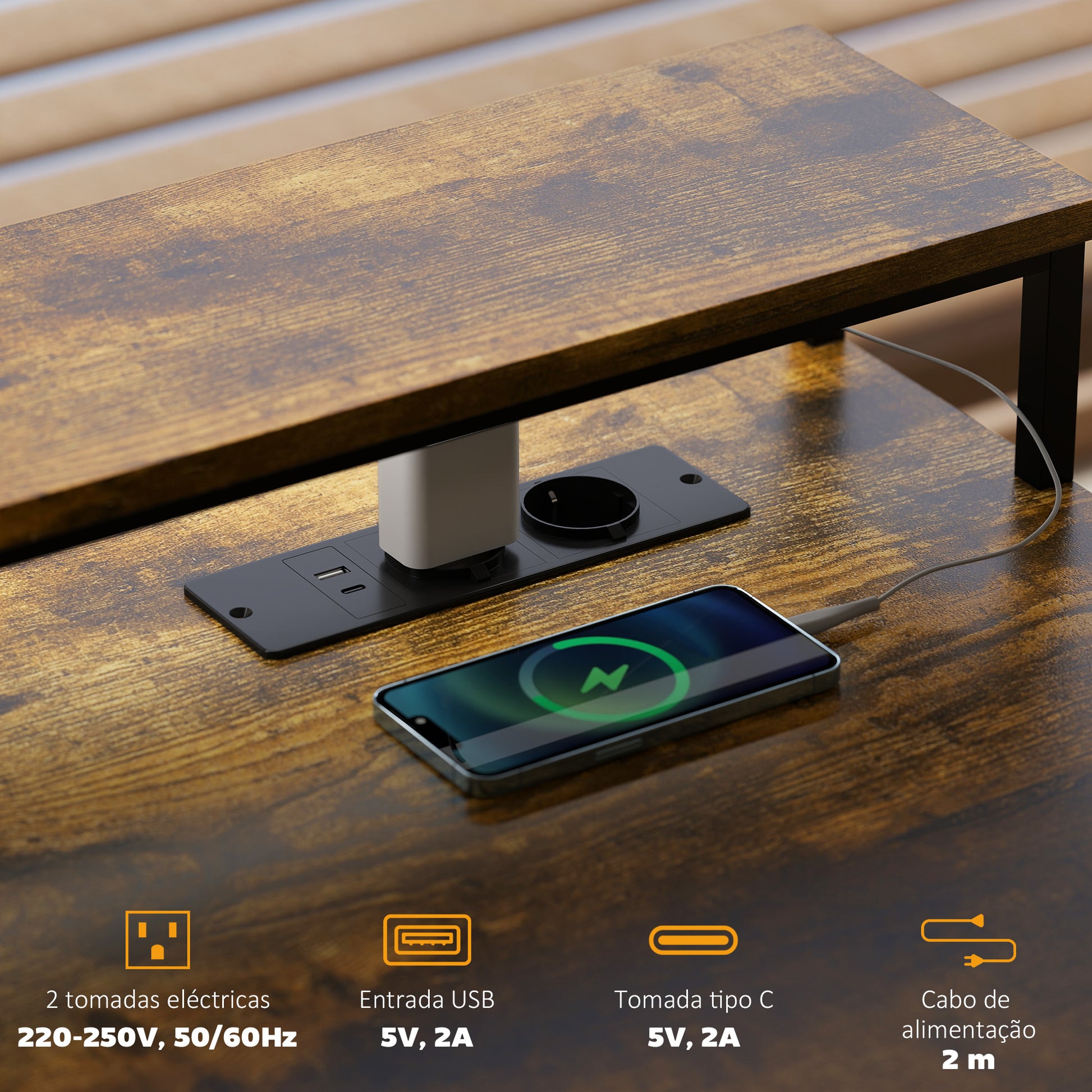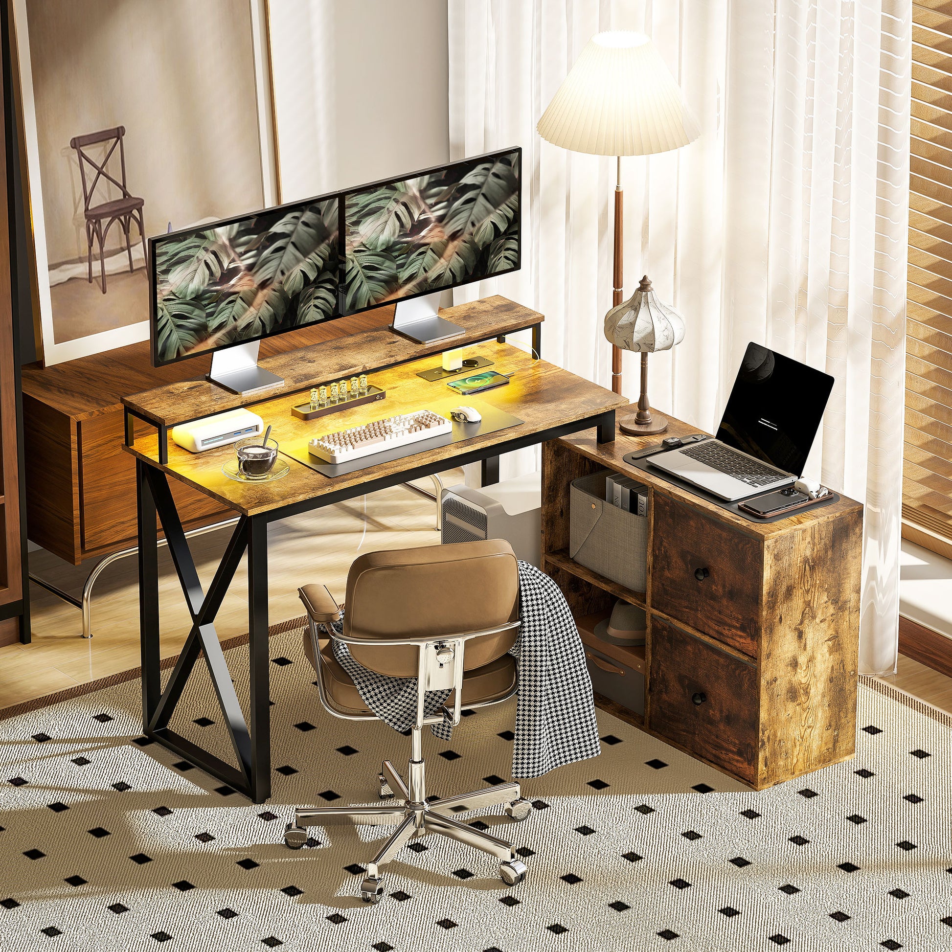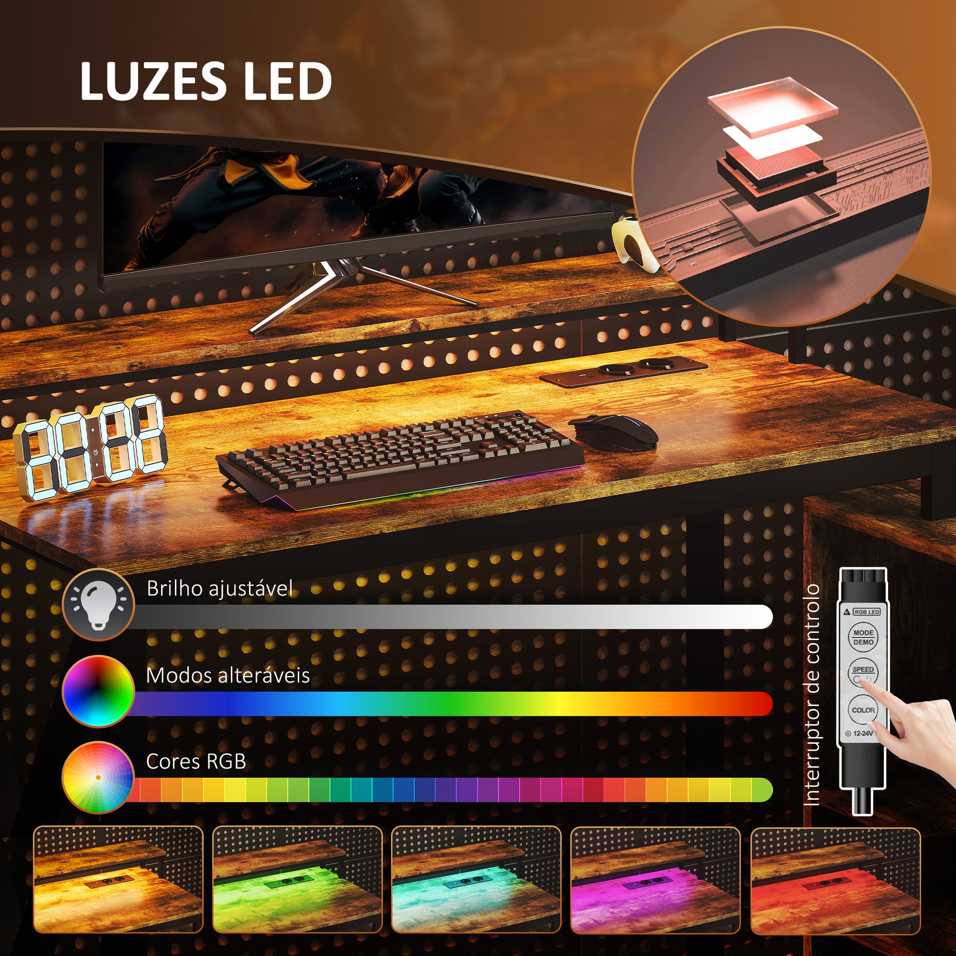 A Secretária de Canto com Luzes LED em Castanho Rústico é a solução ideal para quem procura um espaço de trabalho funcional e com design elegante.