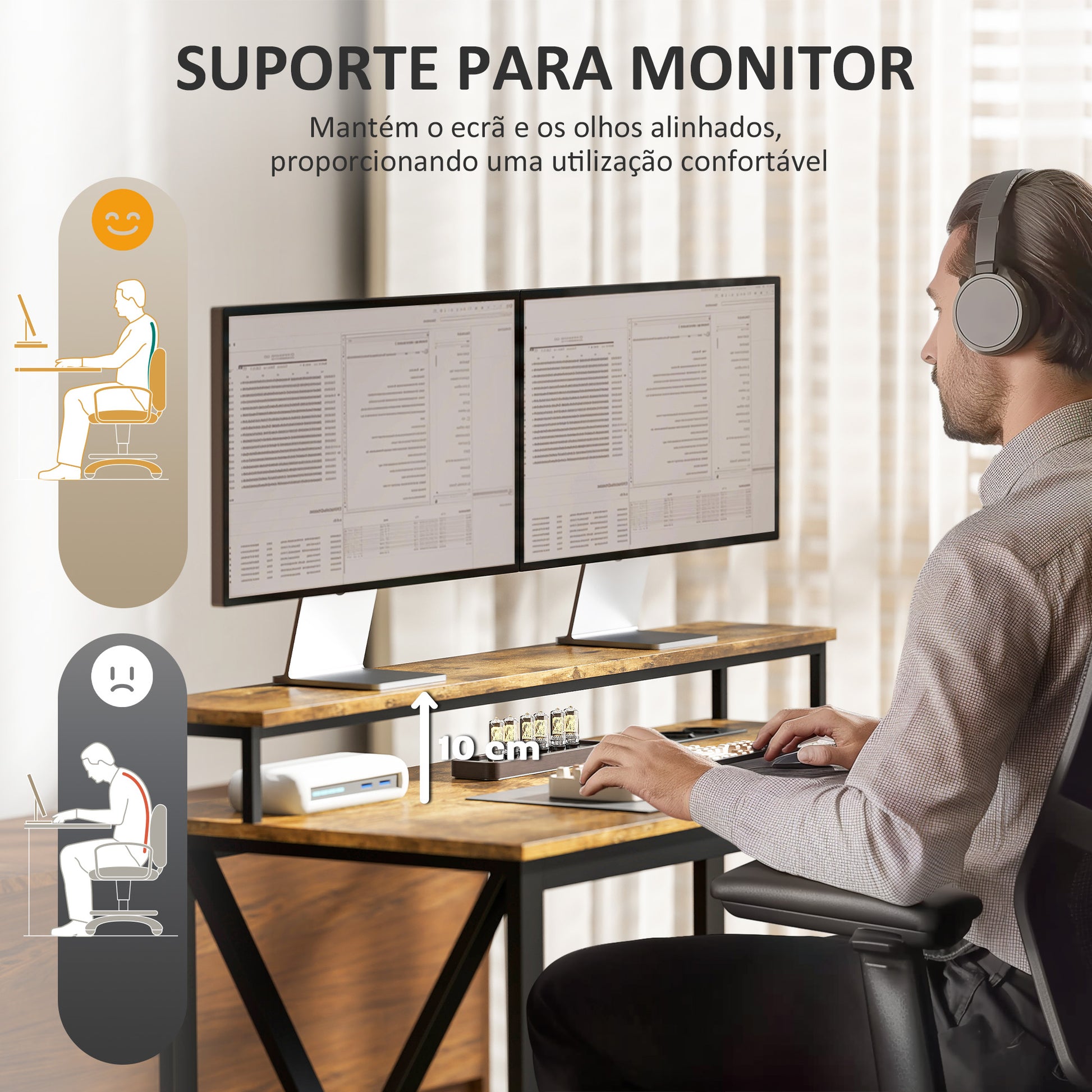 - Usos recomendados: Ideal para configurações de monitor duplo, melhora a postura e reduz a tensão visual.