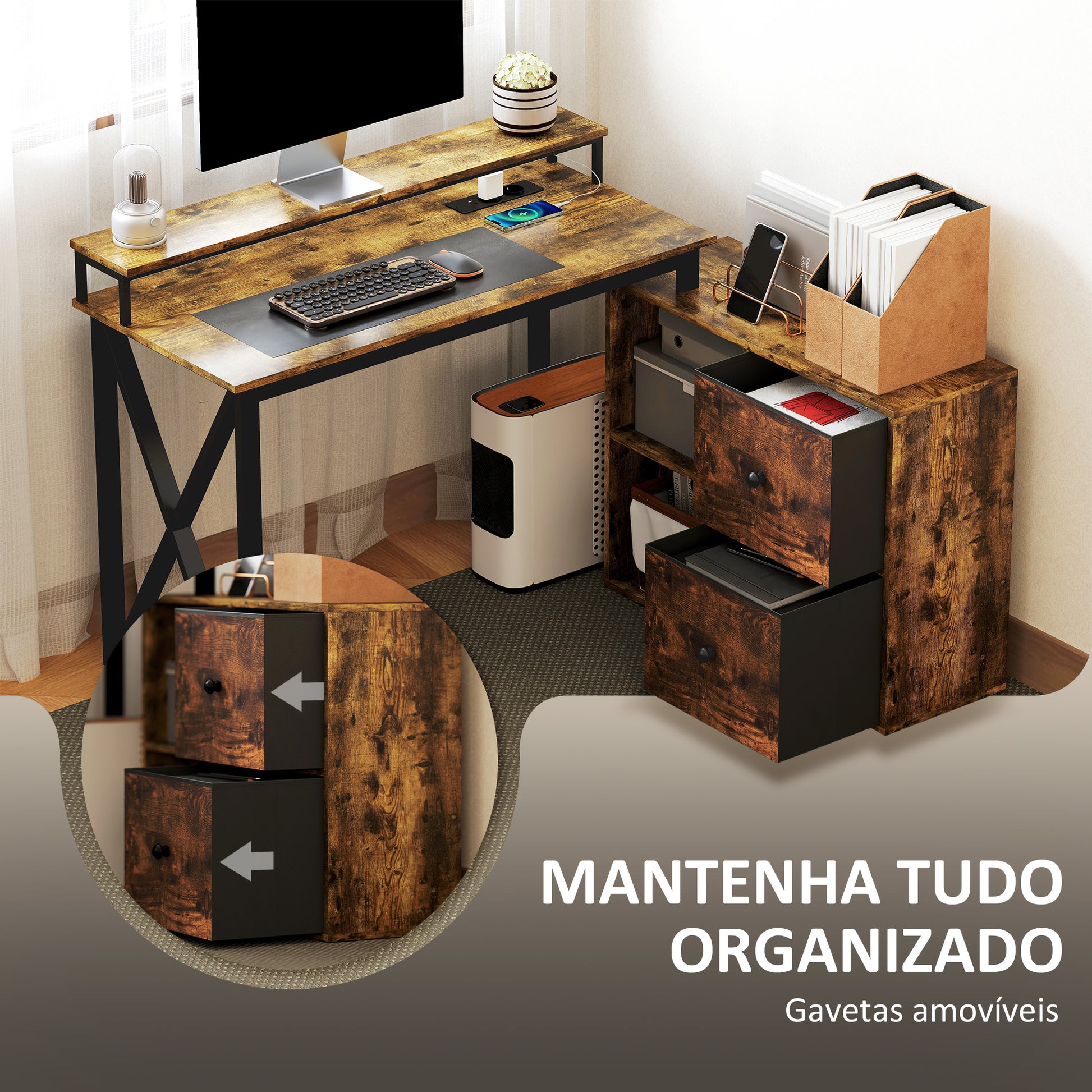 - Benefícios: Dois compartimentos de arrumação, gavetas de tecido, estação de carga integrada, suporte para monitor elevado, iluminação RGB personalizável.