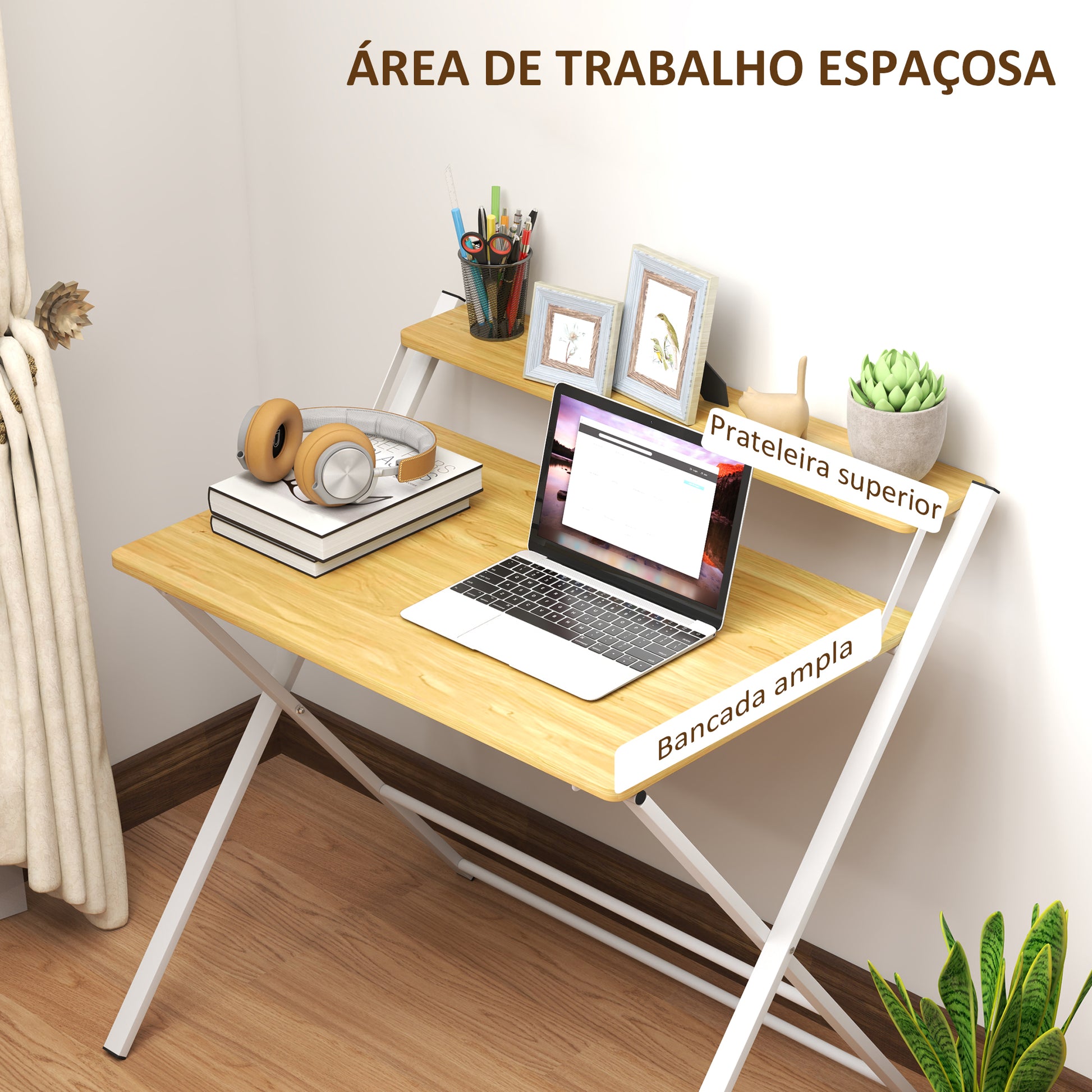 - Benefícios: Design dobrável que permite poupar espaço, prateleira superior para organização e estrutura em forma de X para estabilidade.