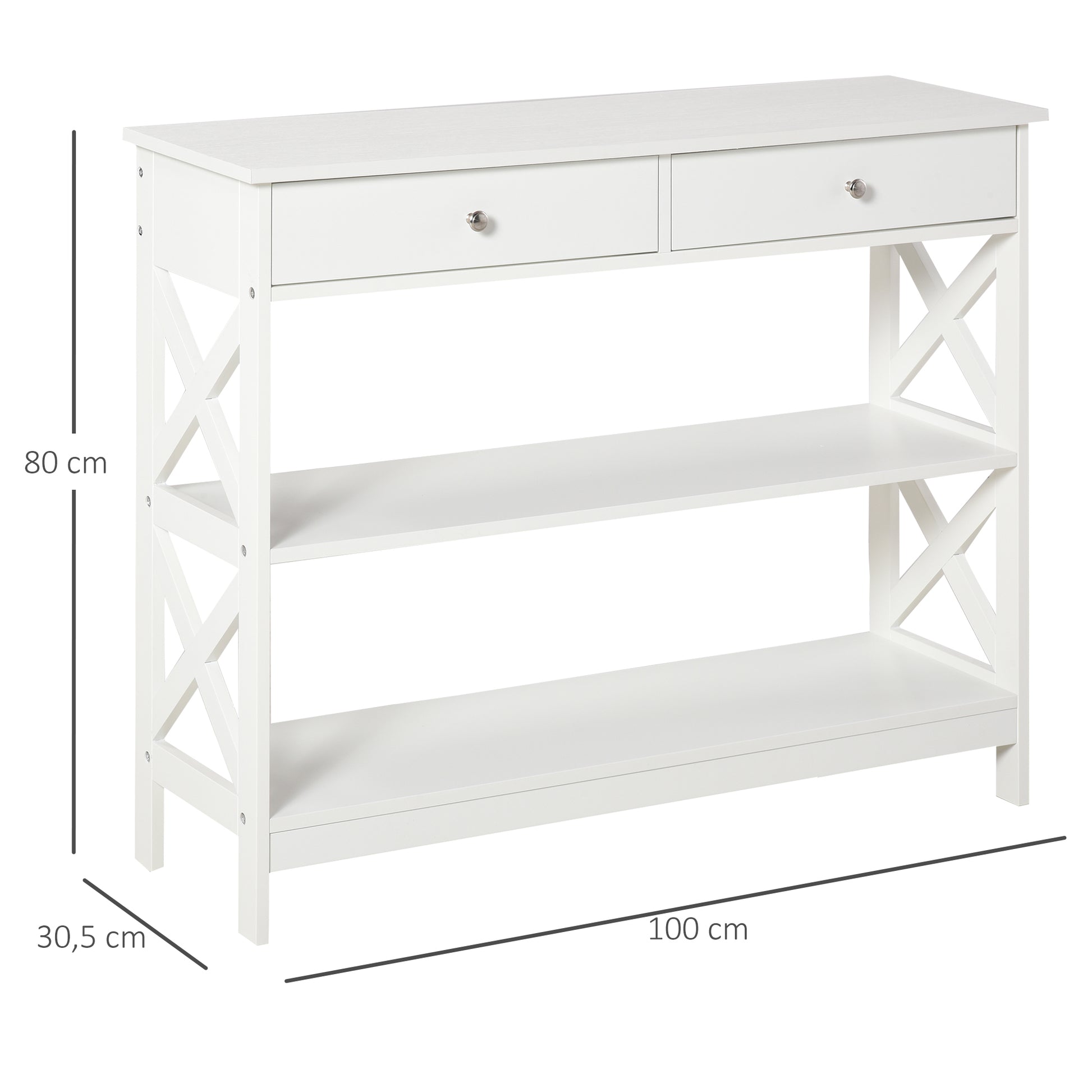 A mesa de console vem com duas gavetas, duas prateleiras inferiores e um design que combina funcionalidade e estilo. Garanta já o seu móvel de hall HOMCOM e transforme o seu espaço com praticidade e elegância.