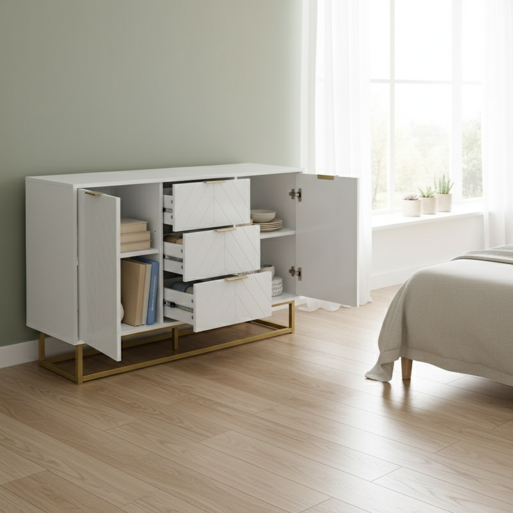 Renove o ambiente da sua casa com este aparador elegante e moderno, perfeito para a sua cozinha, sala de jantar ou sala de estar.