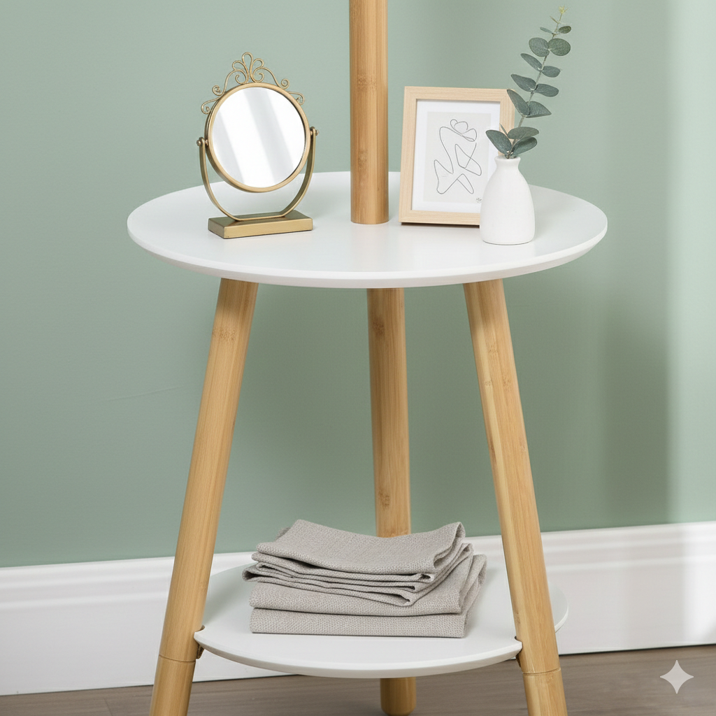 - Benefícios: Estrutura resistente em bambu, mesa circular com prateleiras, 5 ganchos para pendurar casacos e acessórios