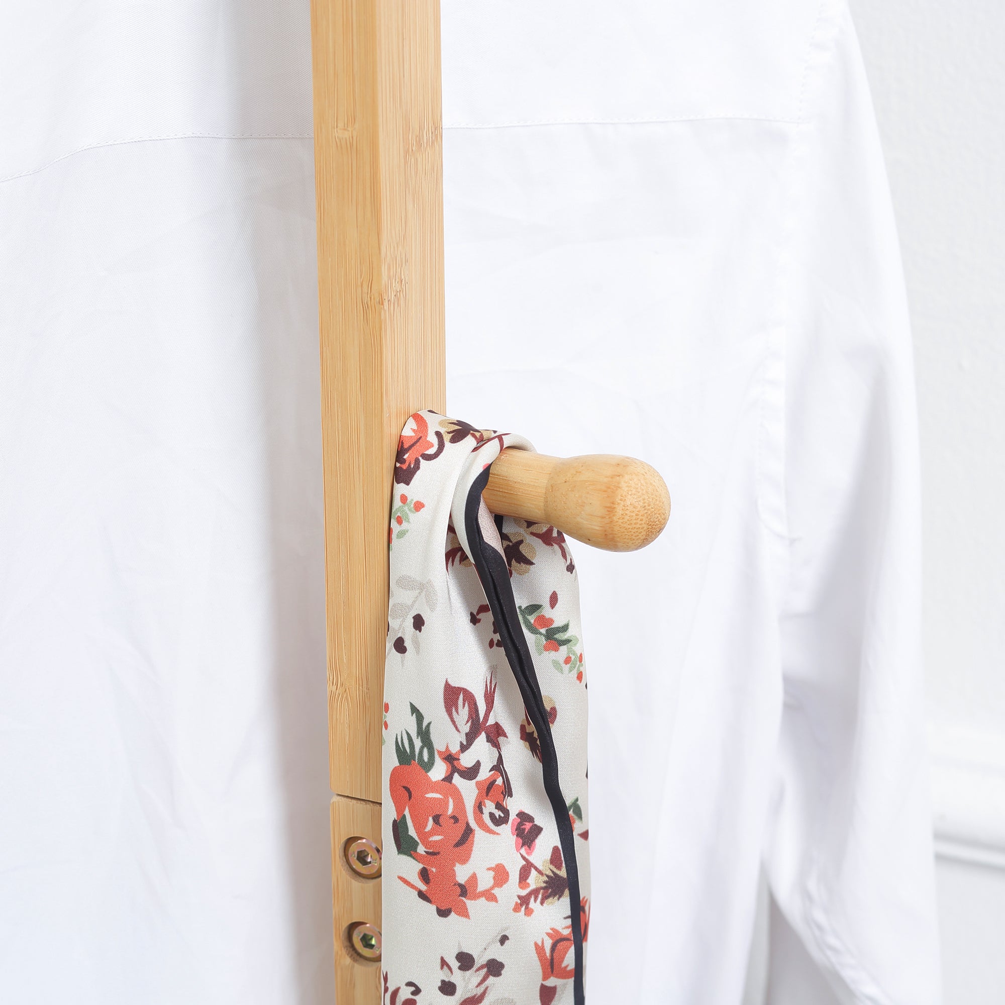 Adicione um toque de estilo moderno à sua casa com este prático cabide de pé de bambu. Com 2 ganchos e 3 barras suspensas, é perfeito para organizar roupas e acessórios.