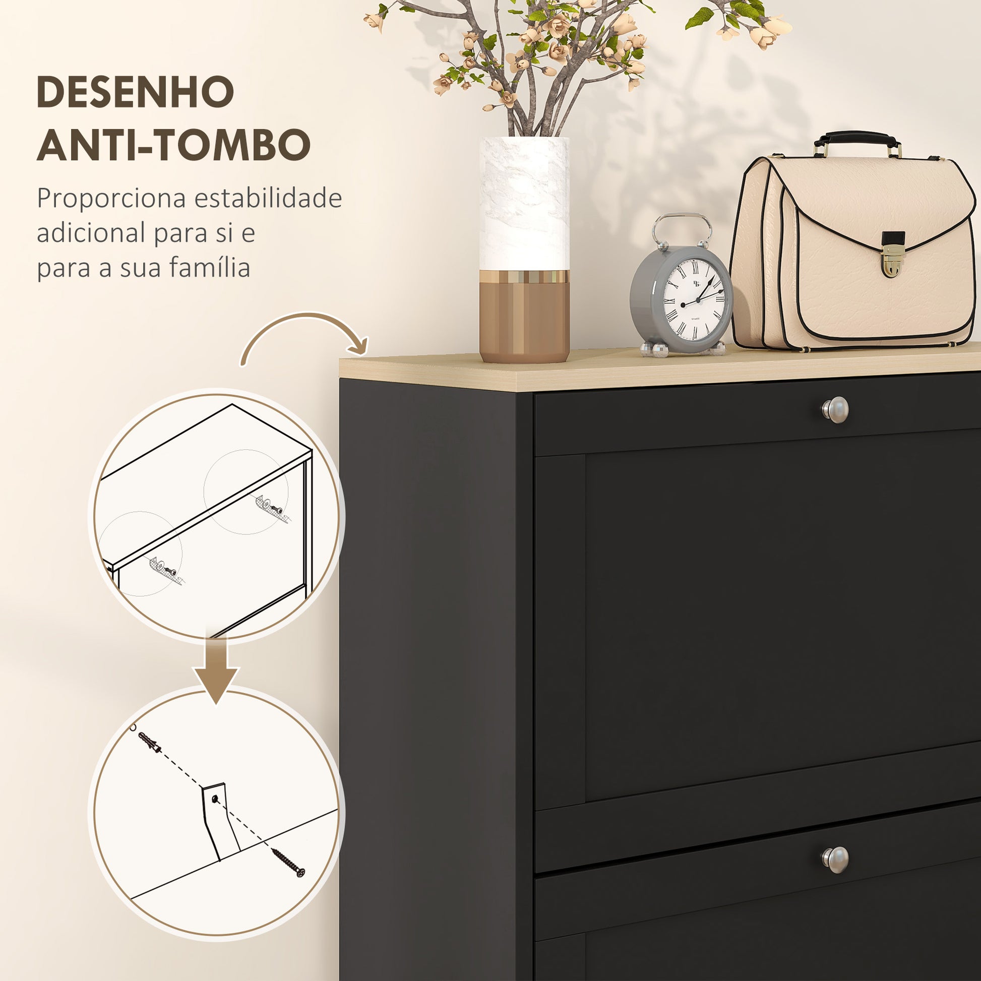 - Benefícios: Três prateleiras ajustáveis de 2 níveis no interior, bancada plana na parte superior para decoração, design anti-tombo para segurança.
