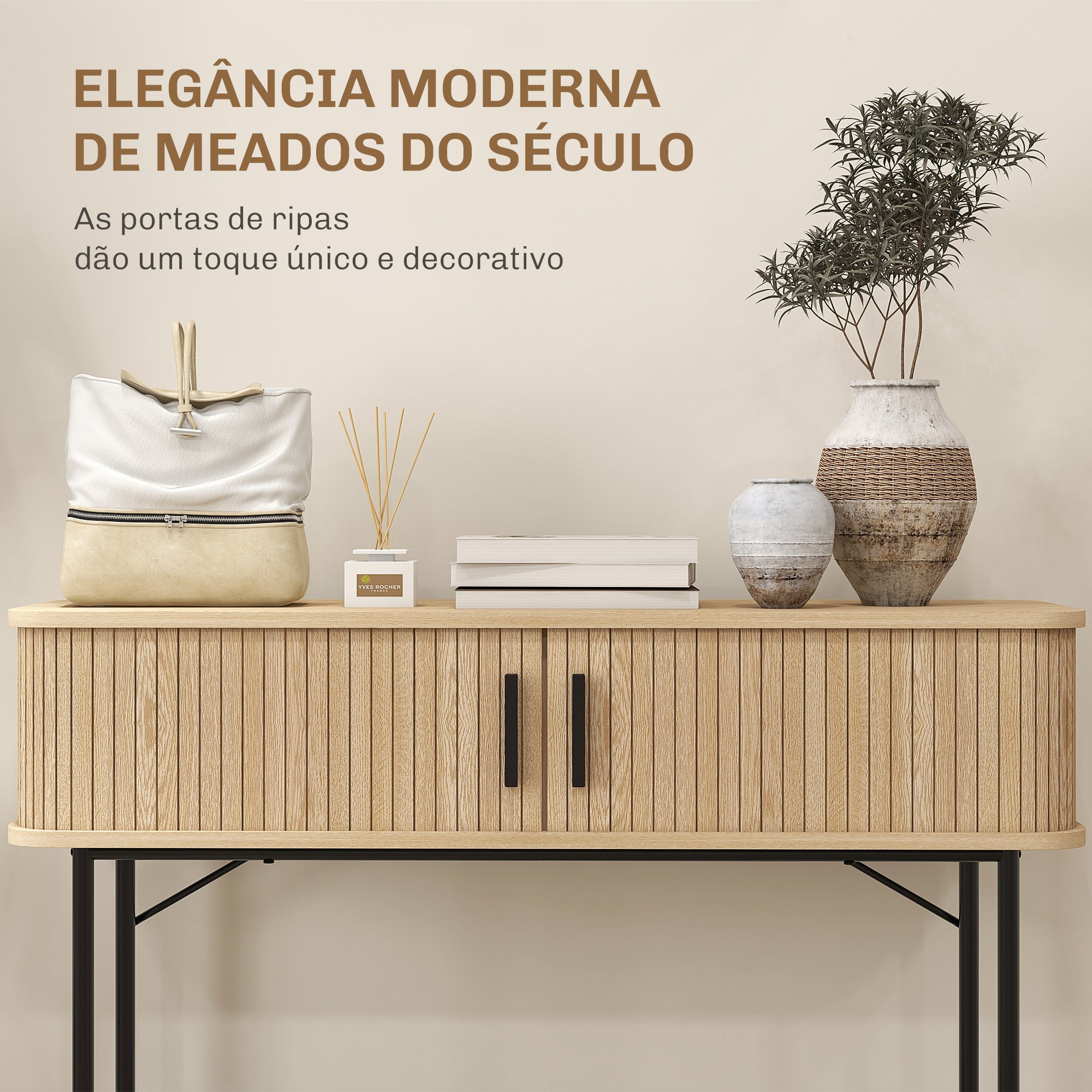 Adicione um toque de meados do século à sua casa com esta mesa consola vintage. A combinação de carvalho e preto cria um contraste sofisticado, enquanto as portas deslizantes proporcionam praticidade em ambientes compactos. A estrutura resistente suporta até 110 kg, tornando-a uma peça durável e funcional.