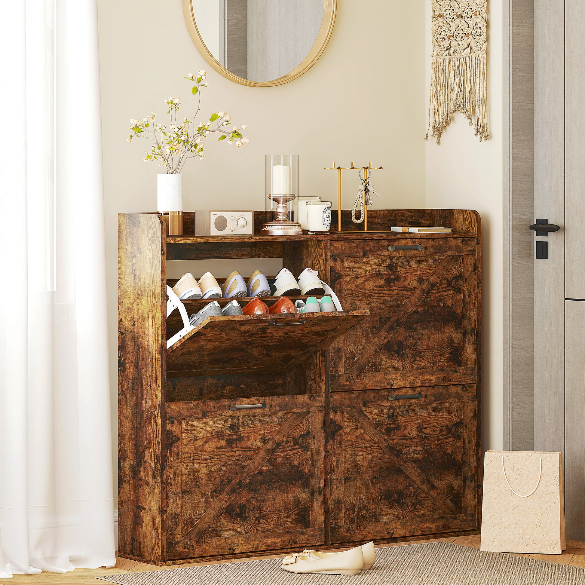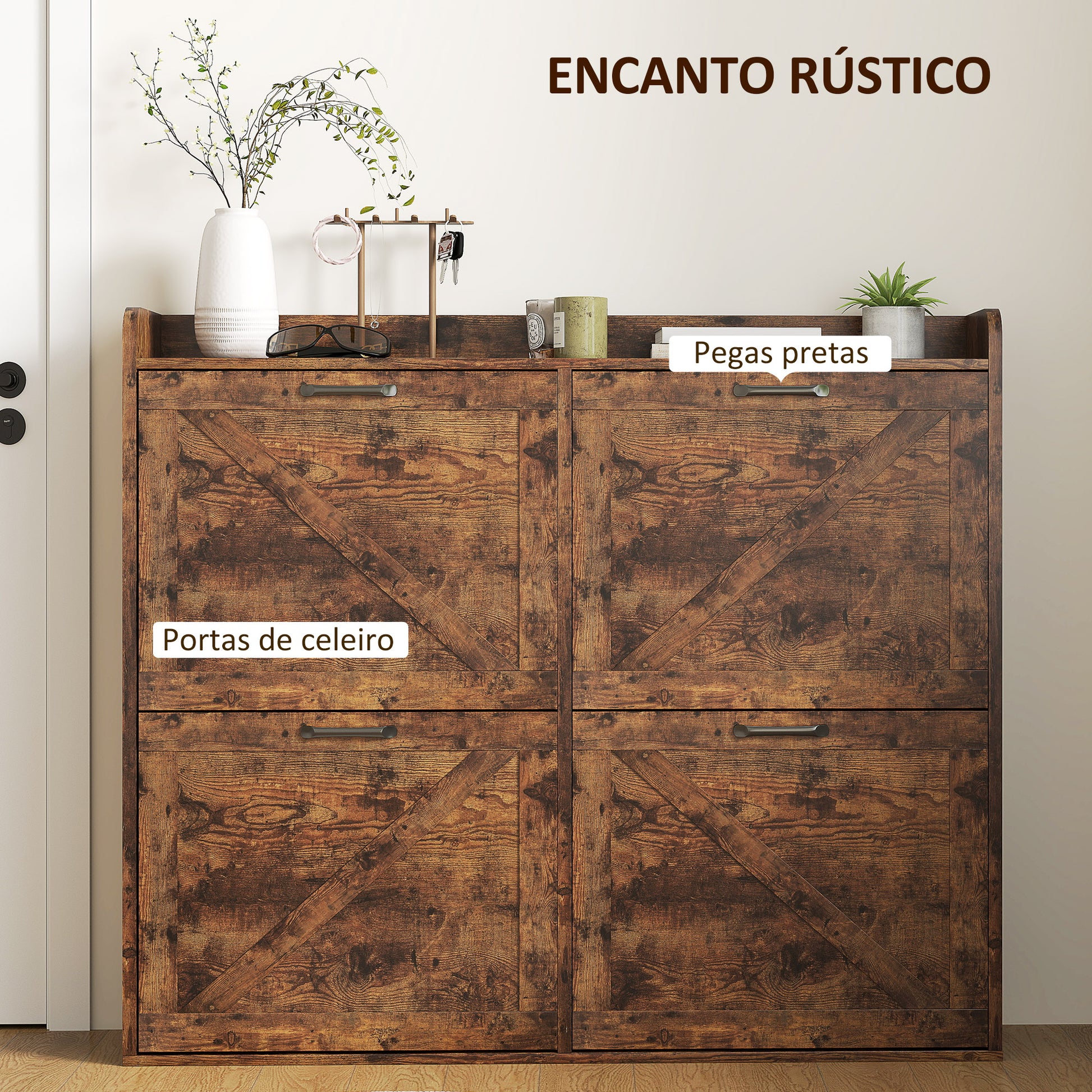 - Benefícios: Design estreito ideal para espaços pequenos, estilo rústico com portas de moldura, superfície para itens essenciais e objetos decorativos, kit anti-tombo para estabilidade, ventilação traseira para manter os sapatos arejados