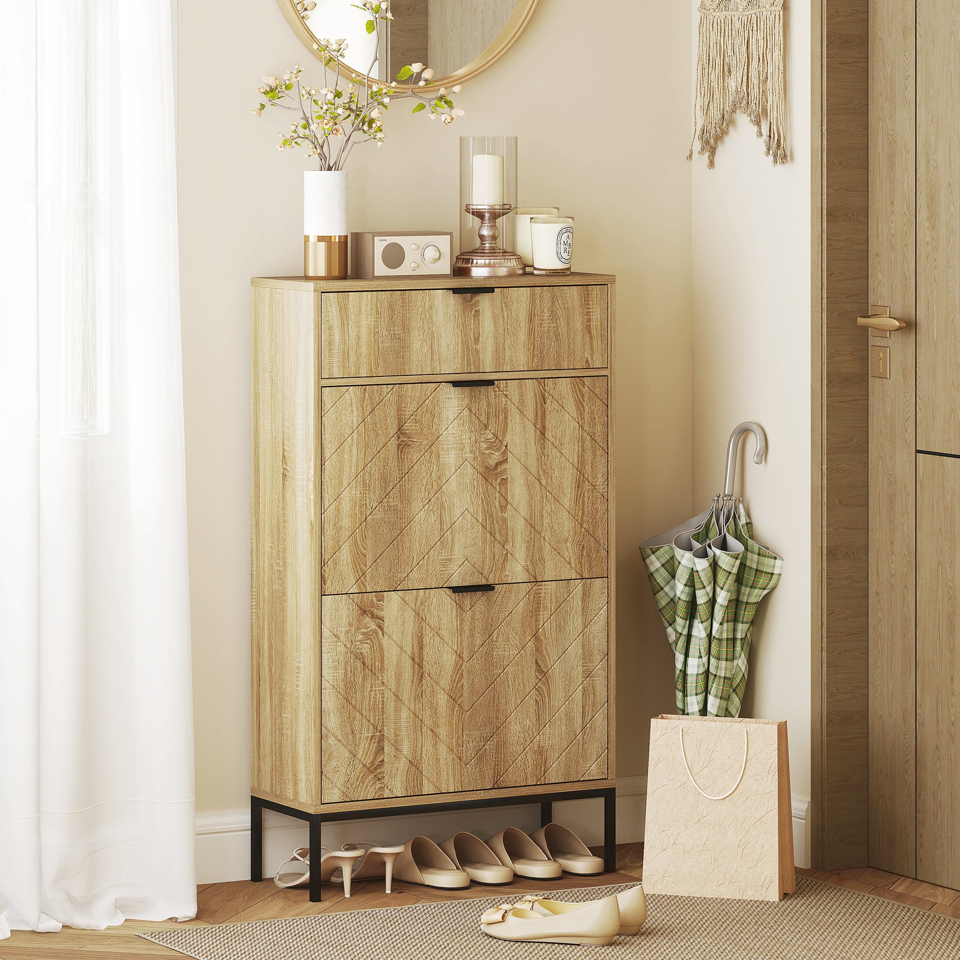 Esta sapateira estreita de madeira é a solução perfeita para organizar até 8 pares de sapatos de forma elegante e eficiente. Com medidas de 60x24x105,5 cm, este móvel compacto e versátil é ideal para corredores estreitos e espaços pequenos. A sua cor de madeira natural e detalhes em chevron entalhado conferem um toque moderno e sofisticado ao ambiente.