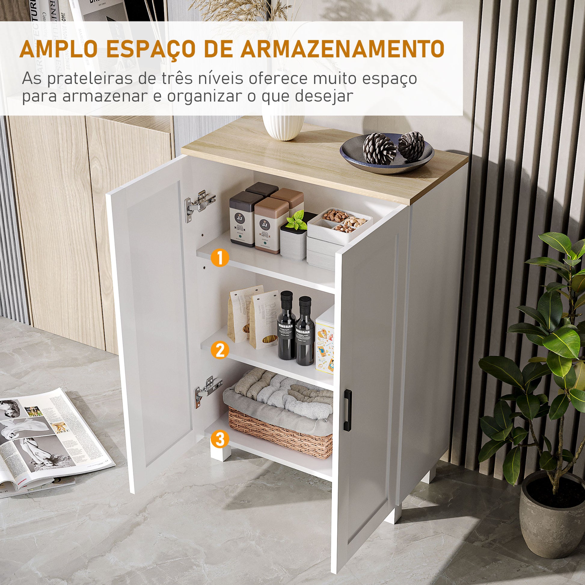 - Benefícios: Oferece amplo espaço de armazenamento com uma bancada espaçosa e um armário de três níveis. As alças facilitam o acesso e o sistema anti-tombo garante segurança.