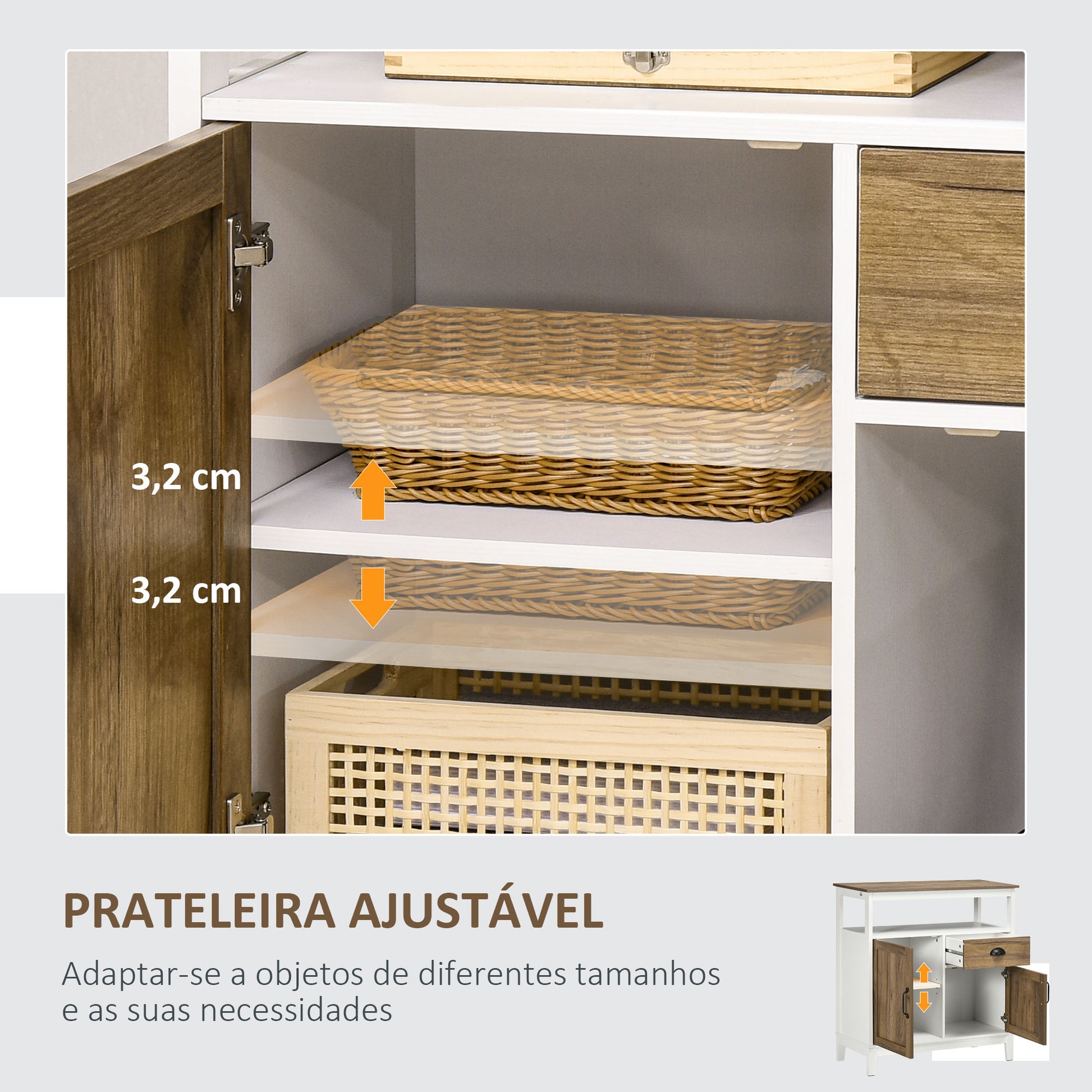 - Benefícios: Oferece um amplo espaço de armazenamento com gaveta, prateleira aberta e dois compartimentos fechados com portas.