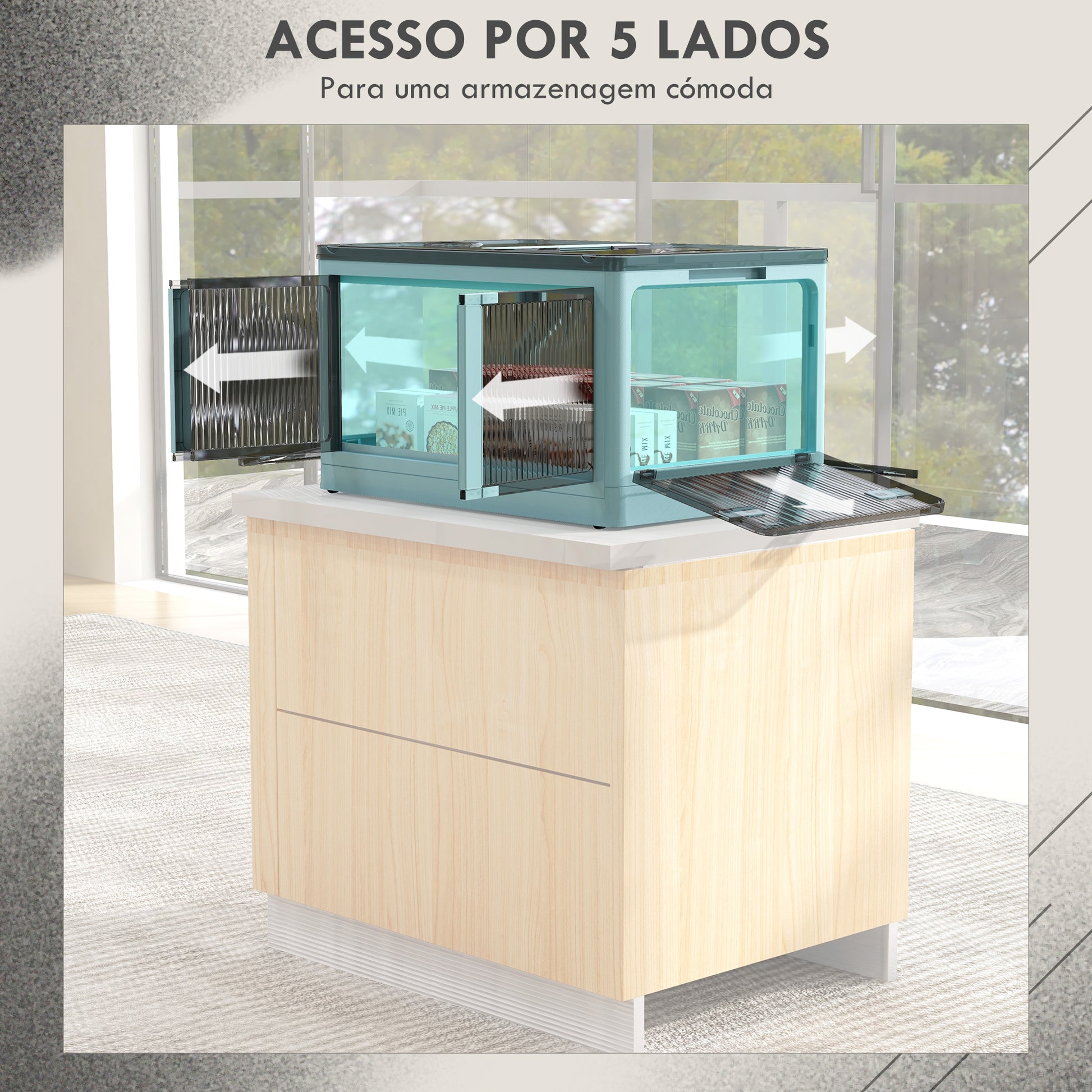 - Benefícios: Design dobrável para fácil transporte e armazenamento em espaços reduzidos. Acesso de 5 lados para uma organização conveniente. Parte superior estriada para empilhamento seguro. Rodas para mobilidade sem esforço.