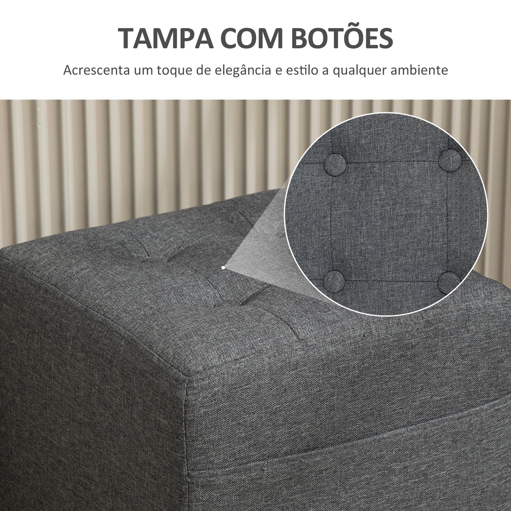 - Materiais: Fabricado em linho (100% poliéster), espuma de alta densidade, madeira de borracha e madeira de eucalipto