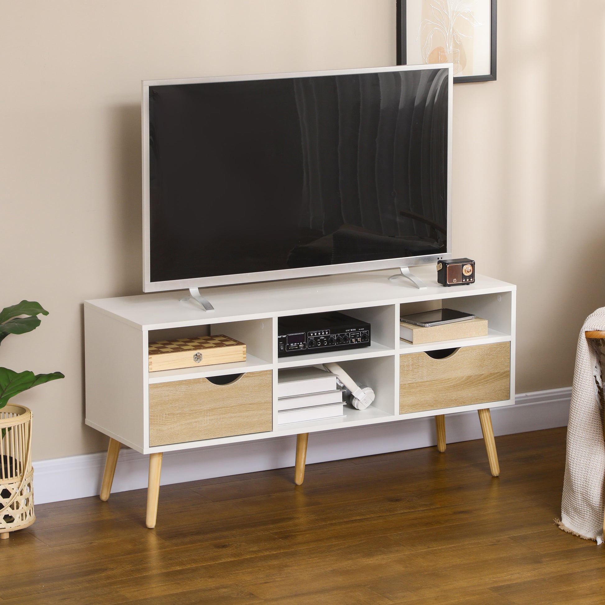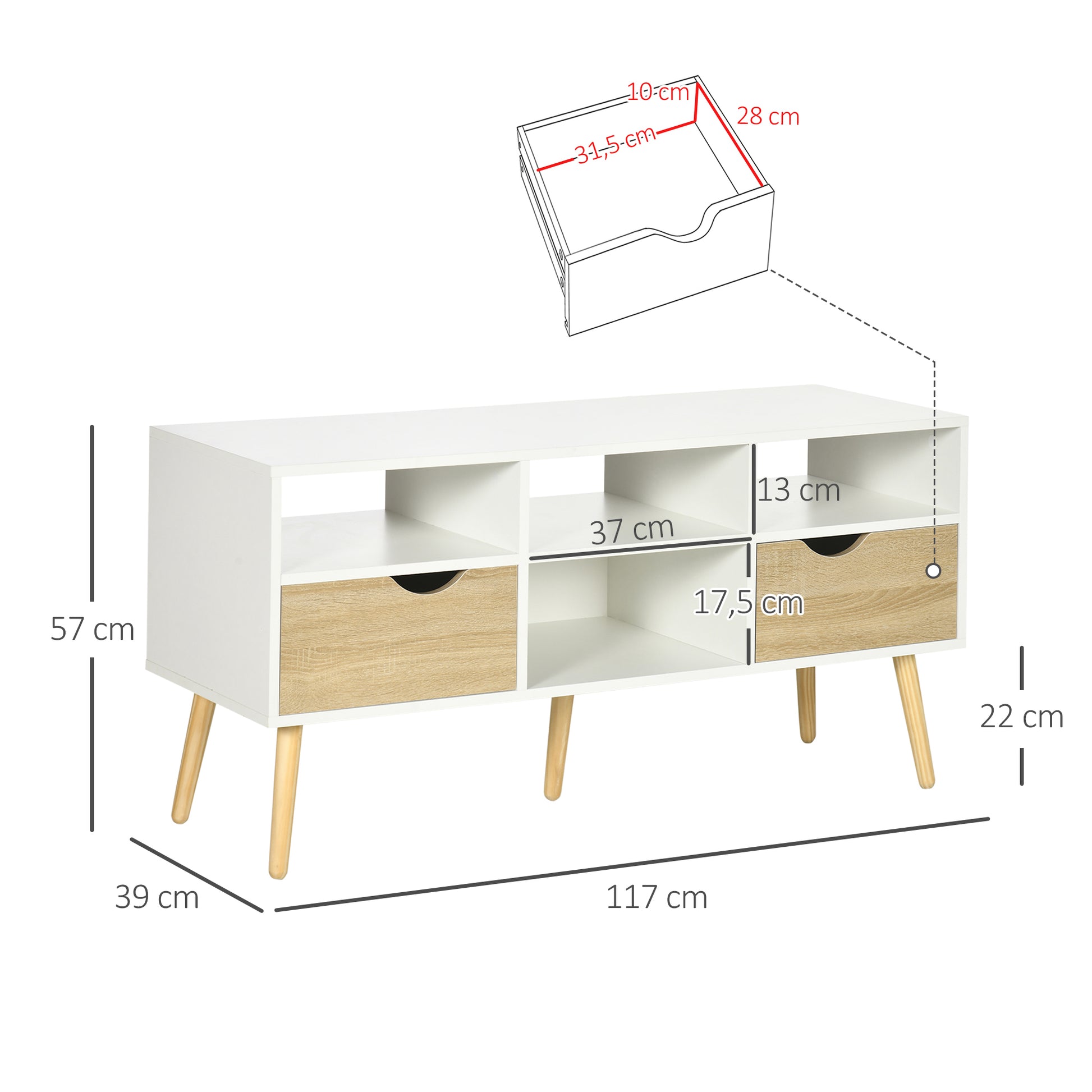 Móvel de TV Moderno com 2 Gavetas e 4 Compartimentos - 117x39x57cm - Cor de Madeira Natural e Branco