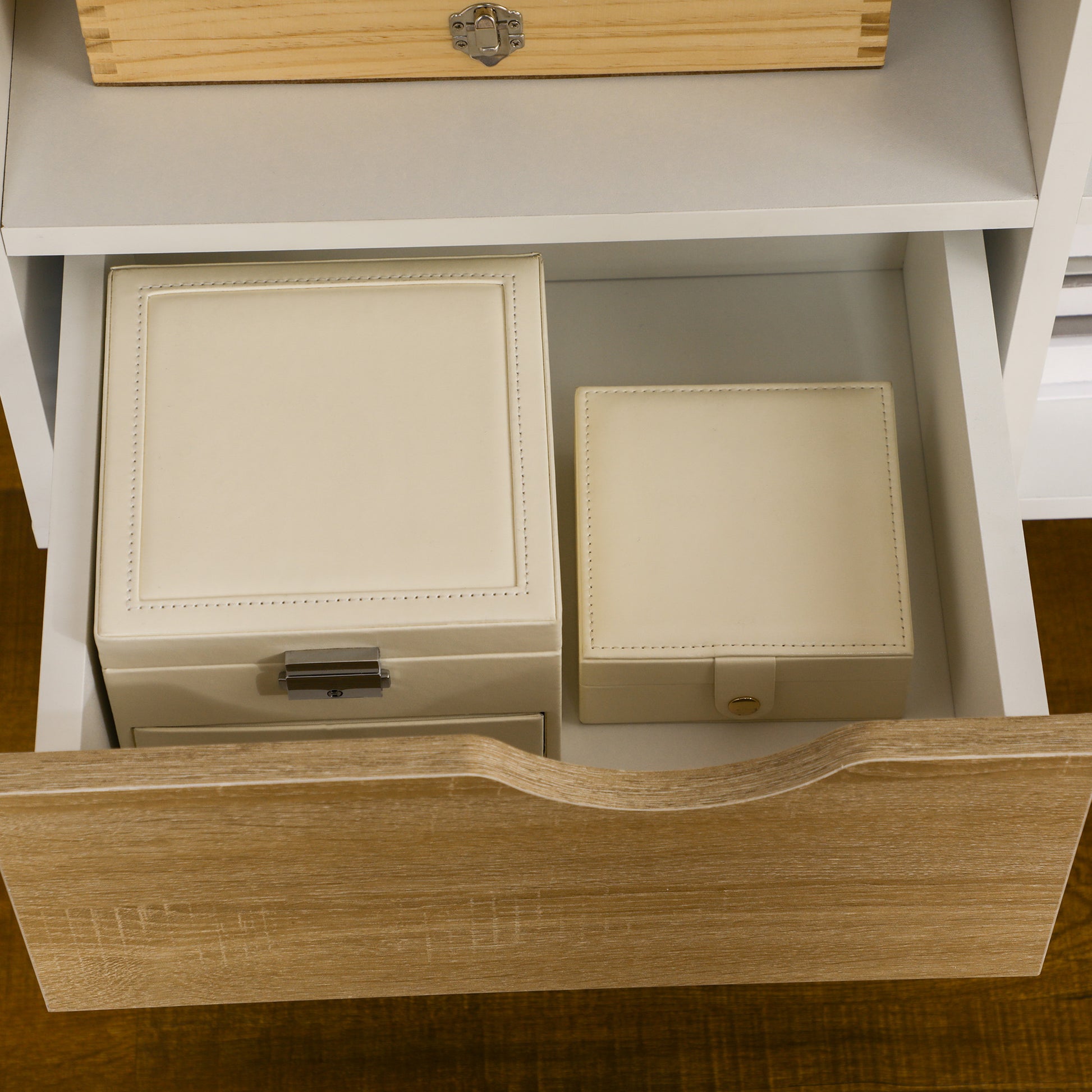 - Materiais: Fabricado em melamina de cor natural e branco, com pés de madeira de abeto.