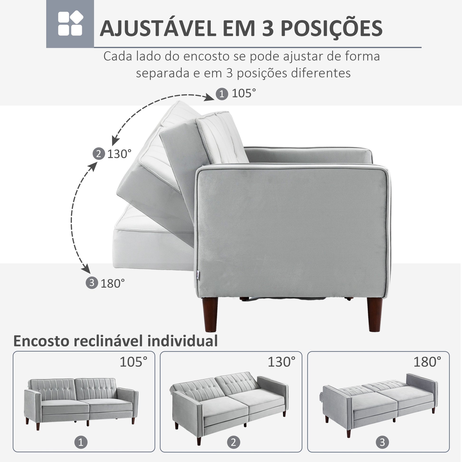 Sofá 2 Lugares Conversível em Cama Aveludada - 189x80,5x78,5 cm - Cinza Claro