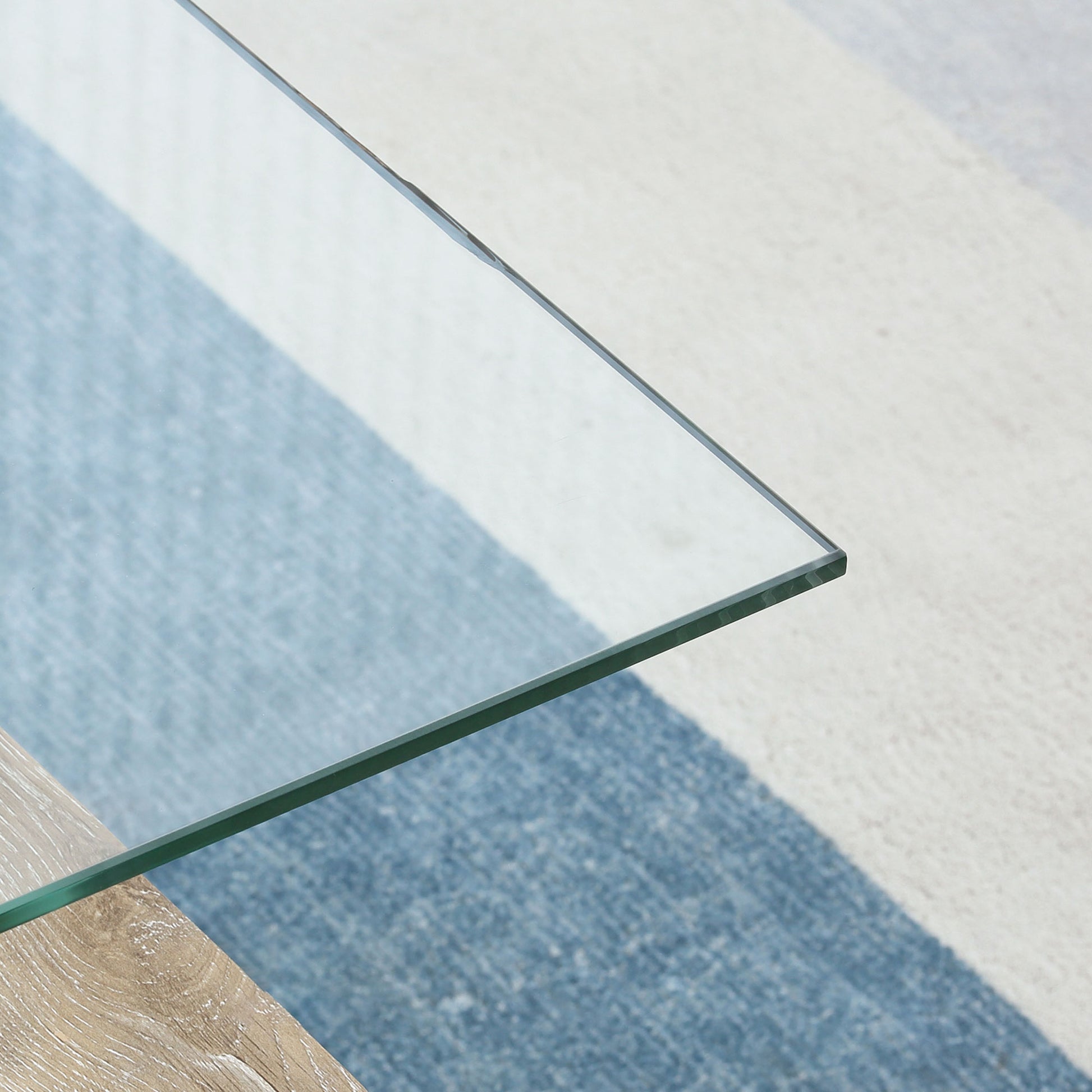 Não hesite em adicionar um toque de estilo incomparável à sua casa com esta mesa de centro sofisticada. A combinação do vidro temperado transparente, estrutura de aço inoxidável e pernas de madeira natural irá transformar o ambiente da sua sala de estar.