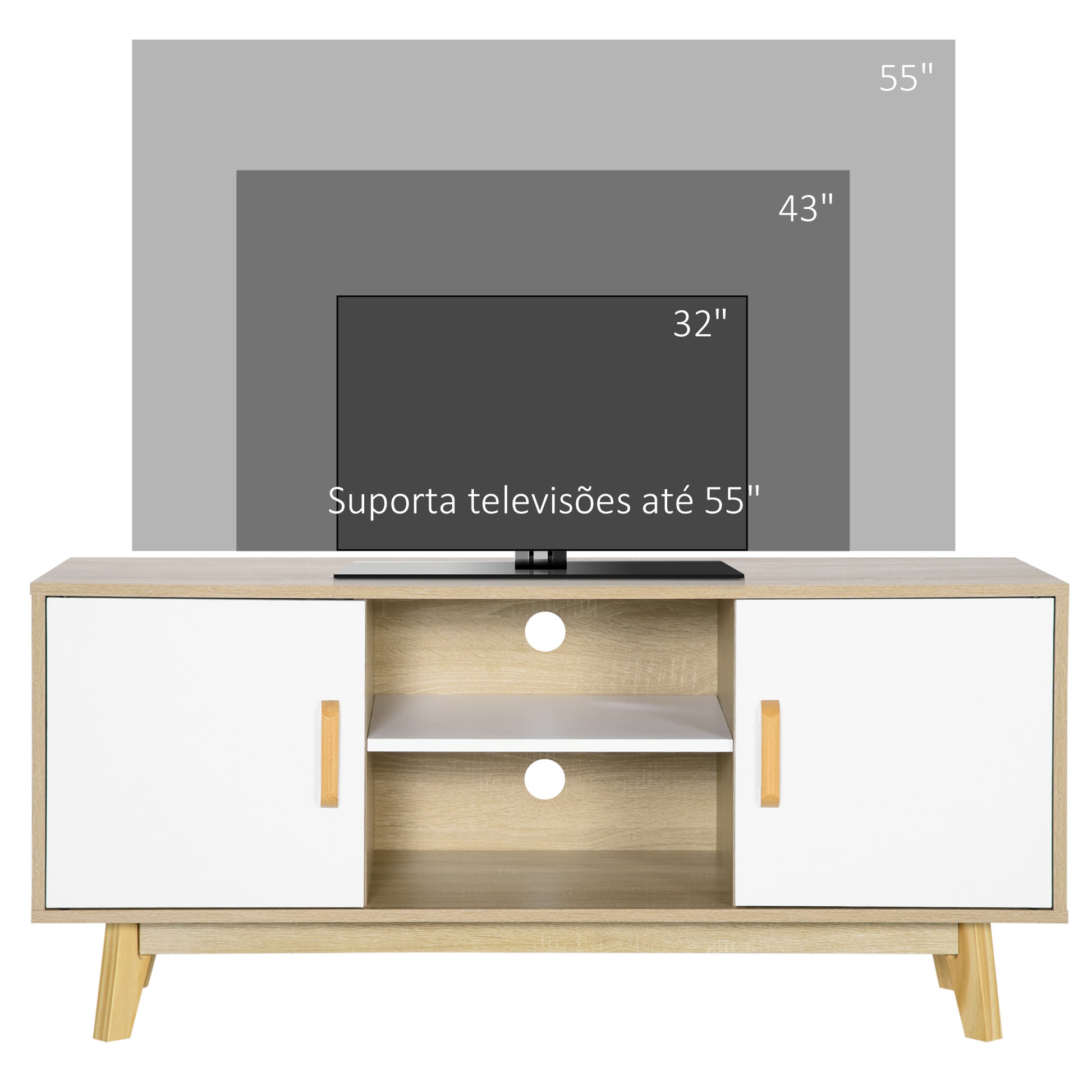 Este móvel de TV moderno é perfeito para televisores de até 55 polegadas, com medidas de 120x40x55 cm na elegante combinação de madeira e branco.