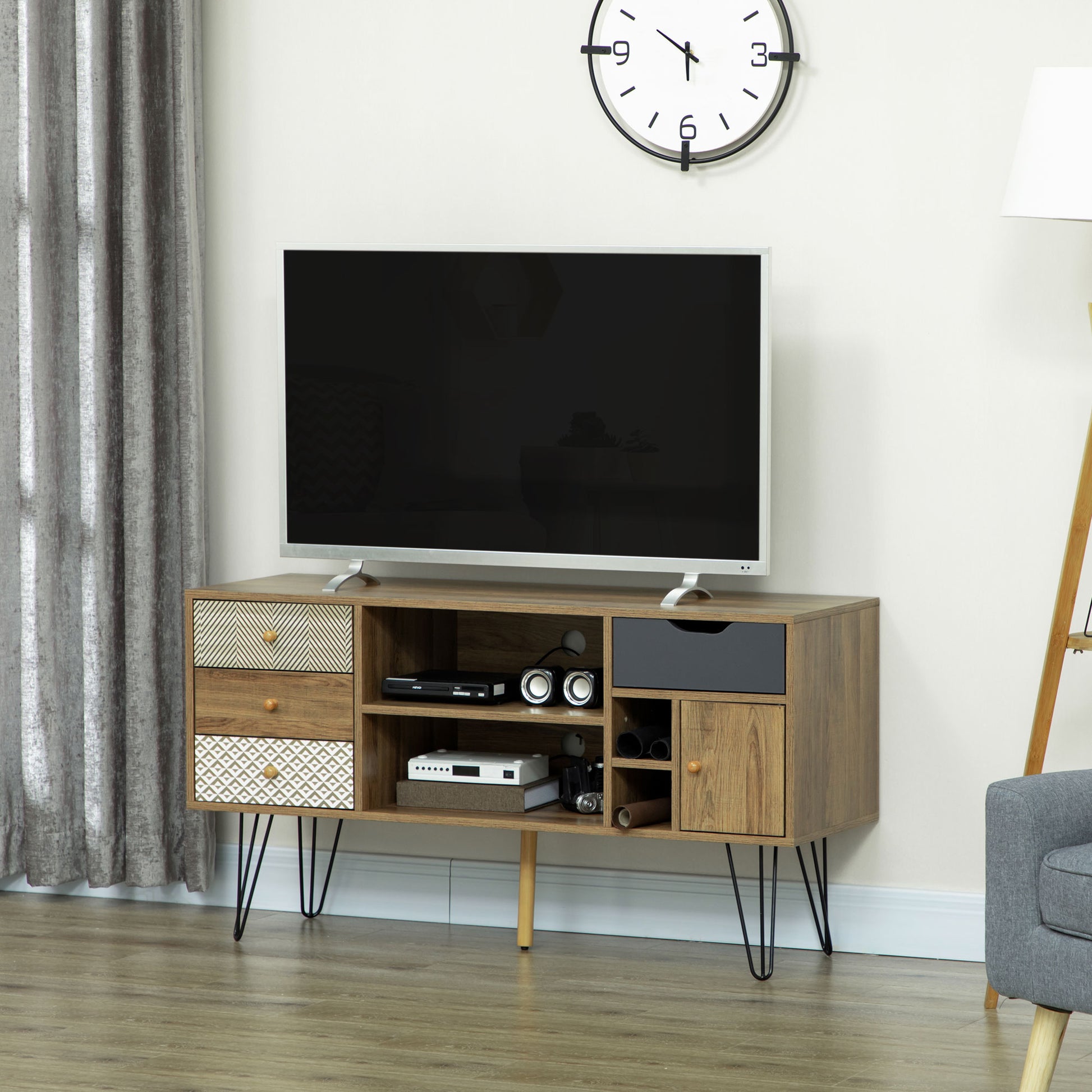 Atualize a sua sala de estar com este móvel de TV de estilo boho·chic, perfeito para televisores de até 50 polegadas. O seu design em marrom e pés de metal conferem um toque de elegância e versatilidade.
