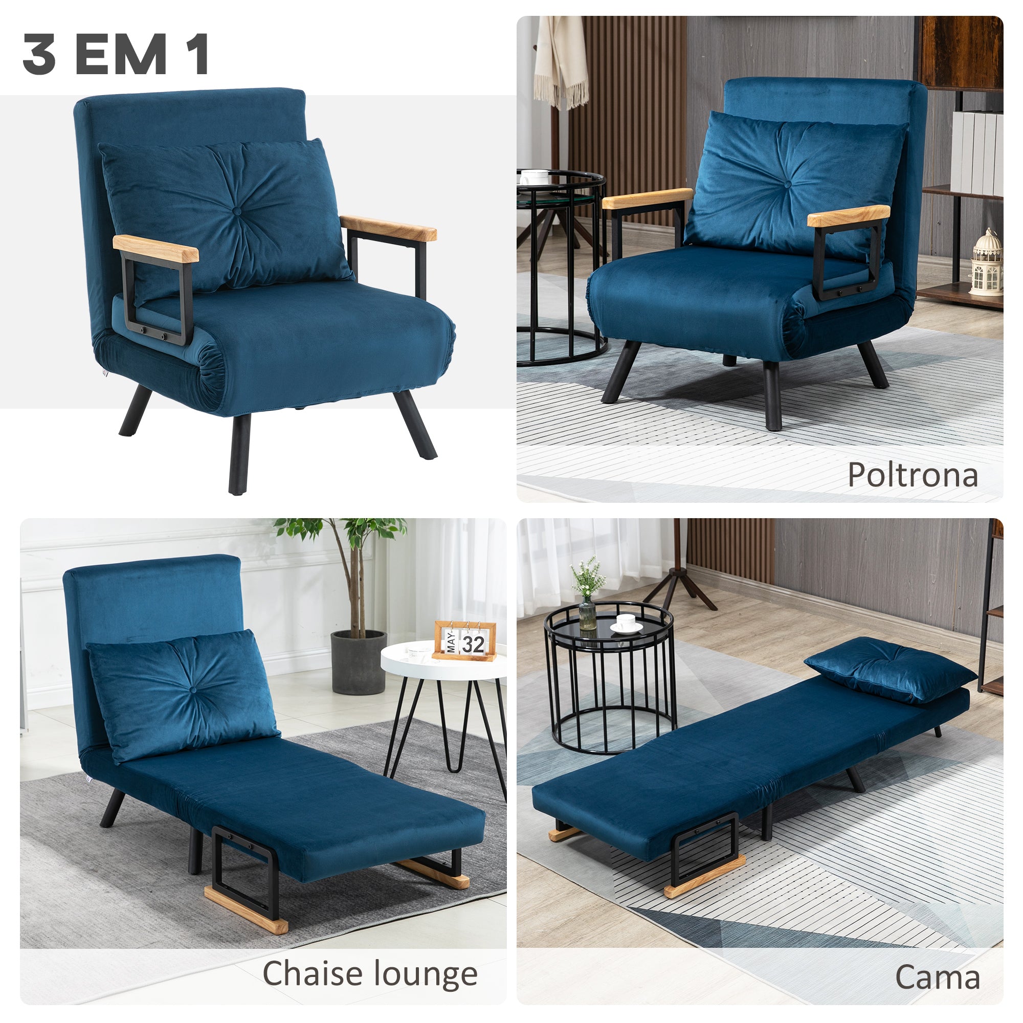 Poltrona Convertível em Cama Dobrável – 63x73x81 cm – Azul Marrinho – Aço, Espuma, Veludo e Madeira de Borracha