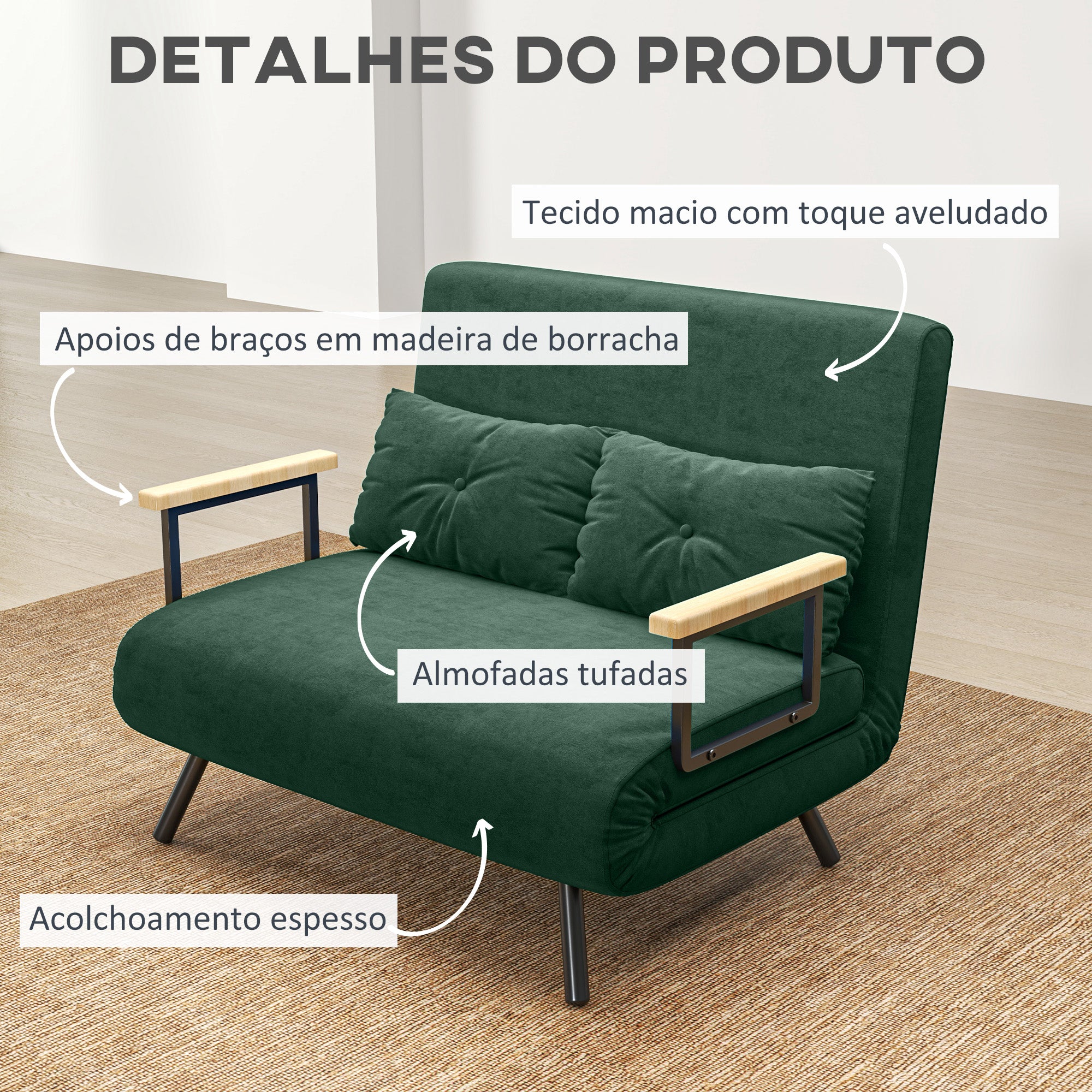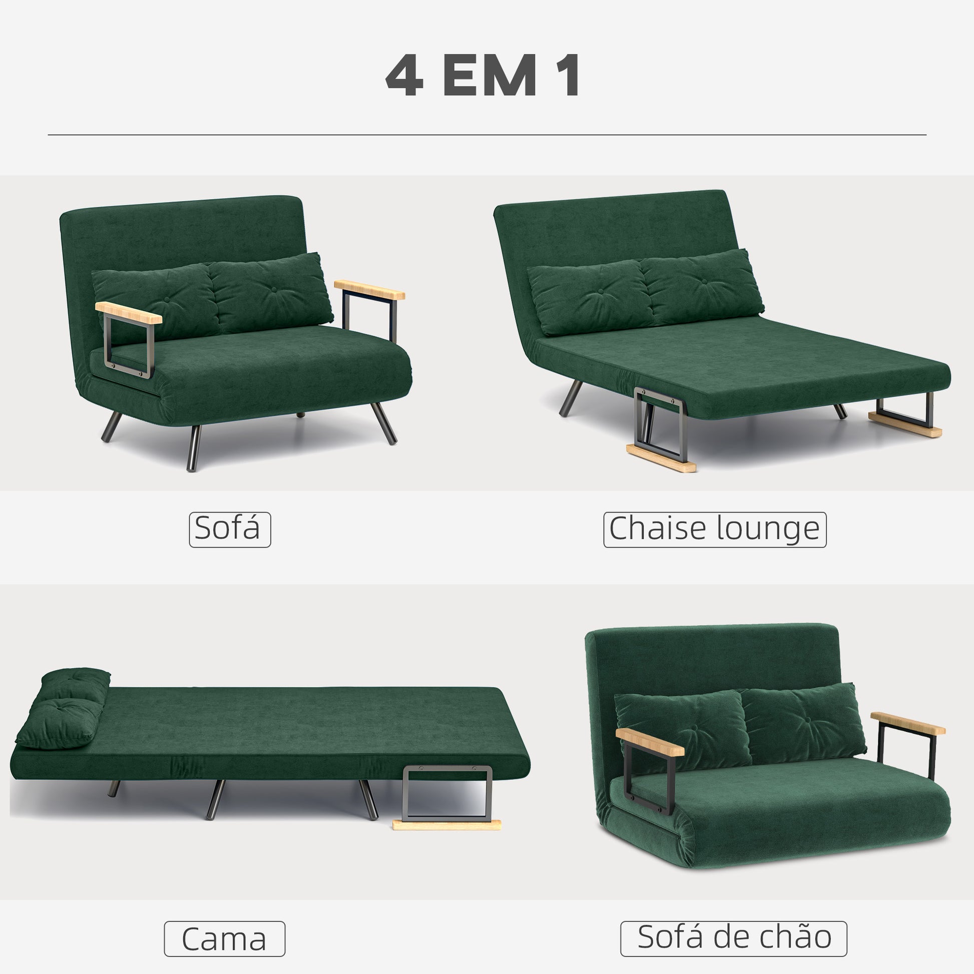 Sofá Cama Convertível Verde – 102x73x81 cm – Aço, veludo, espuma