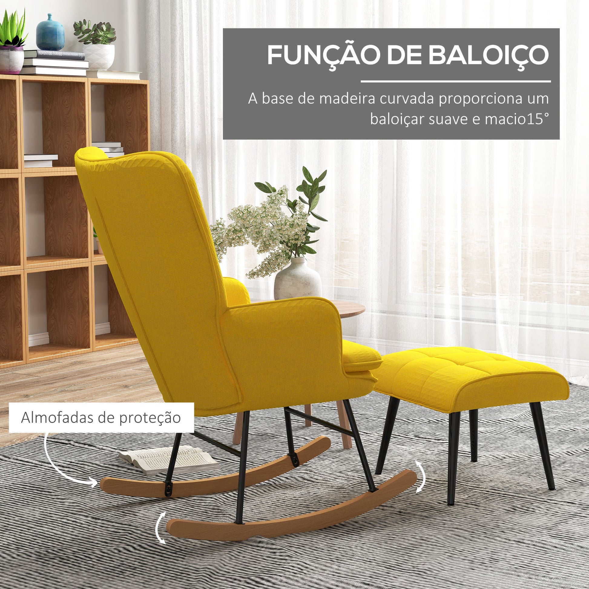 - Benefícios: Encosto alto e inclinado, apoios para os braços e acolchoamento espesso proporcionam conforto para sestas, leitura e relaxamento. Pernas curvas de madeira permitem balançar suavemente.
