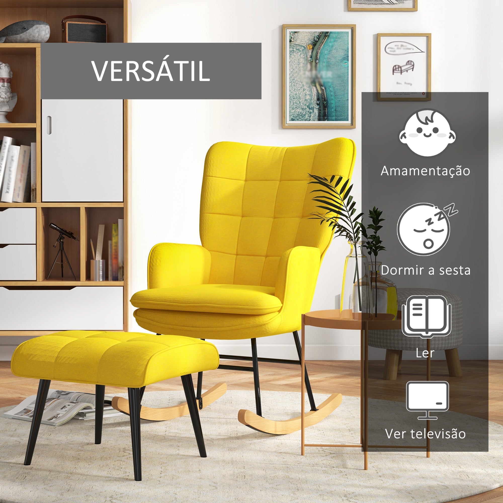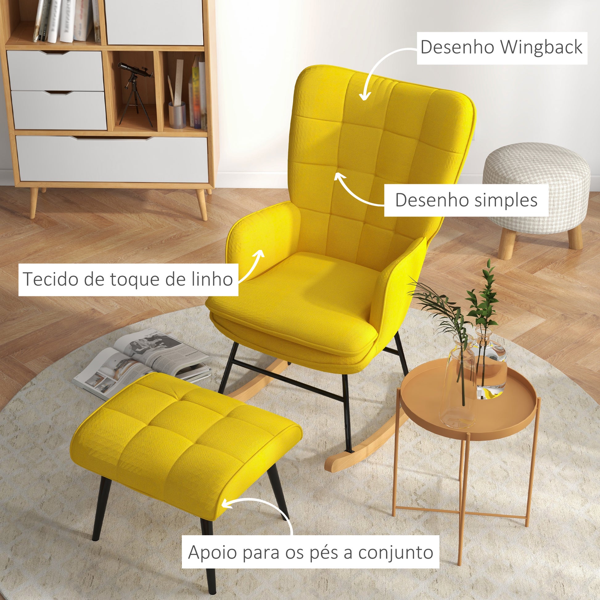 Traga elegância e conforto para sua casa com esta poltrona de baloiço amarela, que inclui um apoio para os pés a condizer. O design wingback acrescenta um toque de sofisticação, tornando-a uma peça de destaque em qualquer espaço.