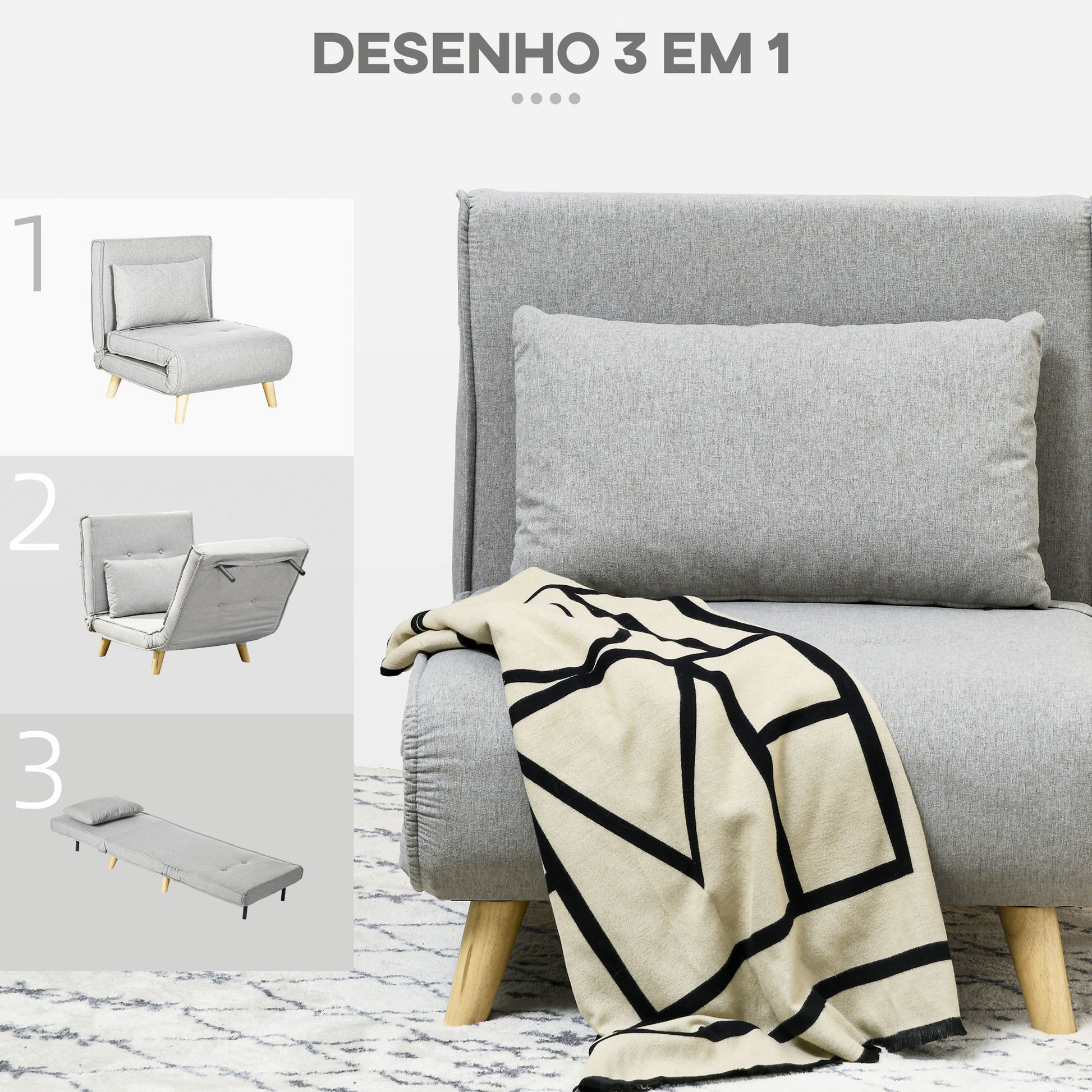 Poltrona Cama Individual Dobrável – 72x78x79 cm – Cinzenta – Tecido de linho sintético