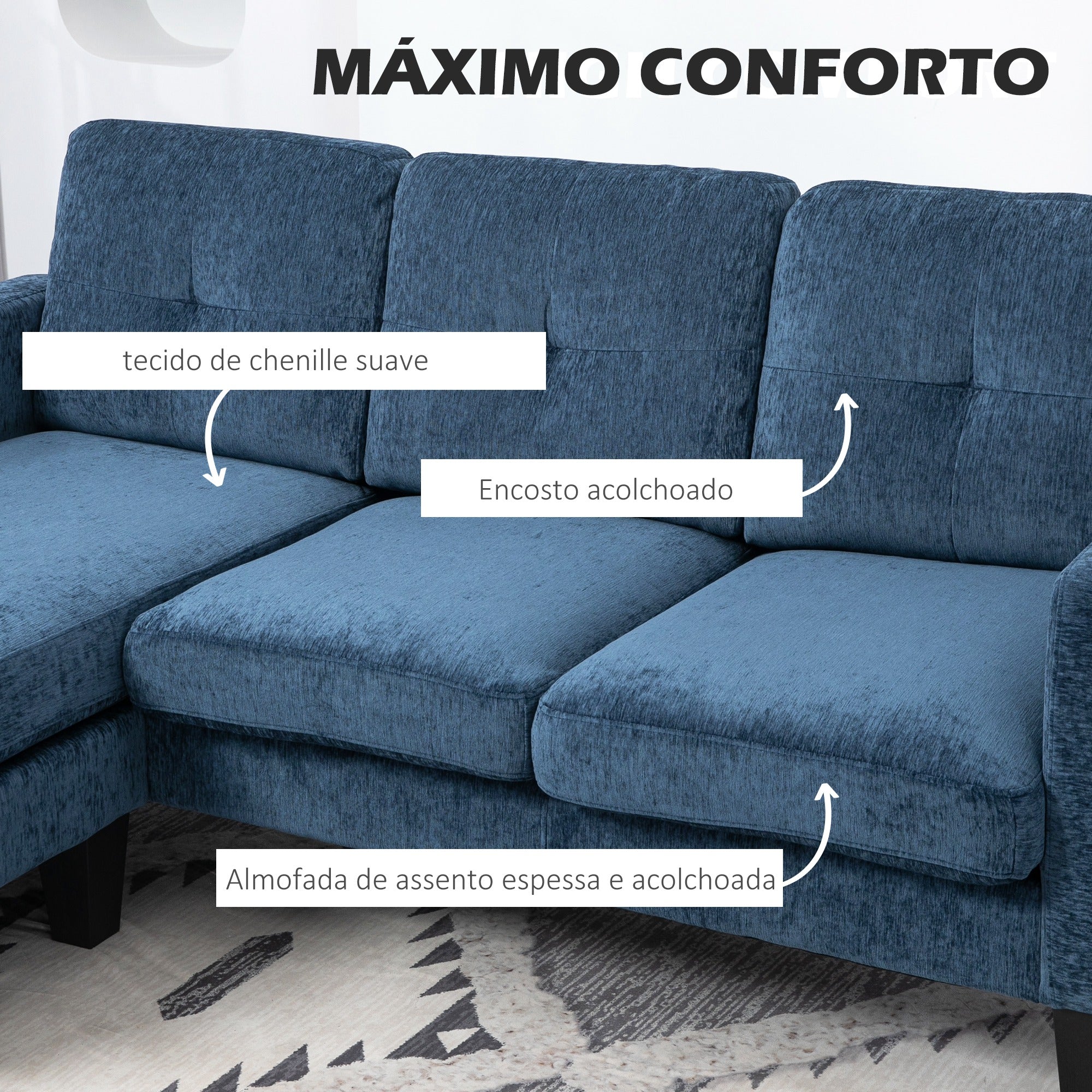 O Sofá Chaise Longue em Formato de L Azul é o complemento perfeito para qualquer espaço, oferecendo conforto, estilo e funcionalidade.