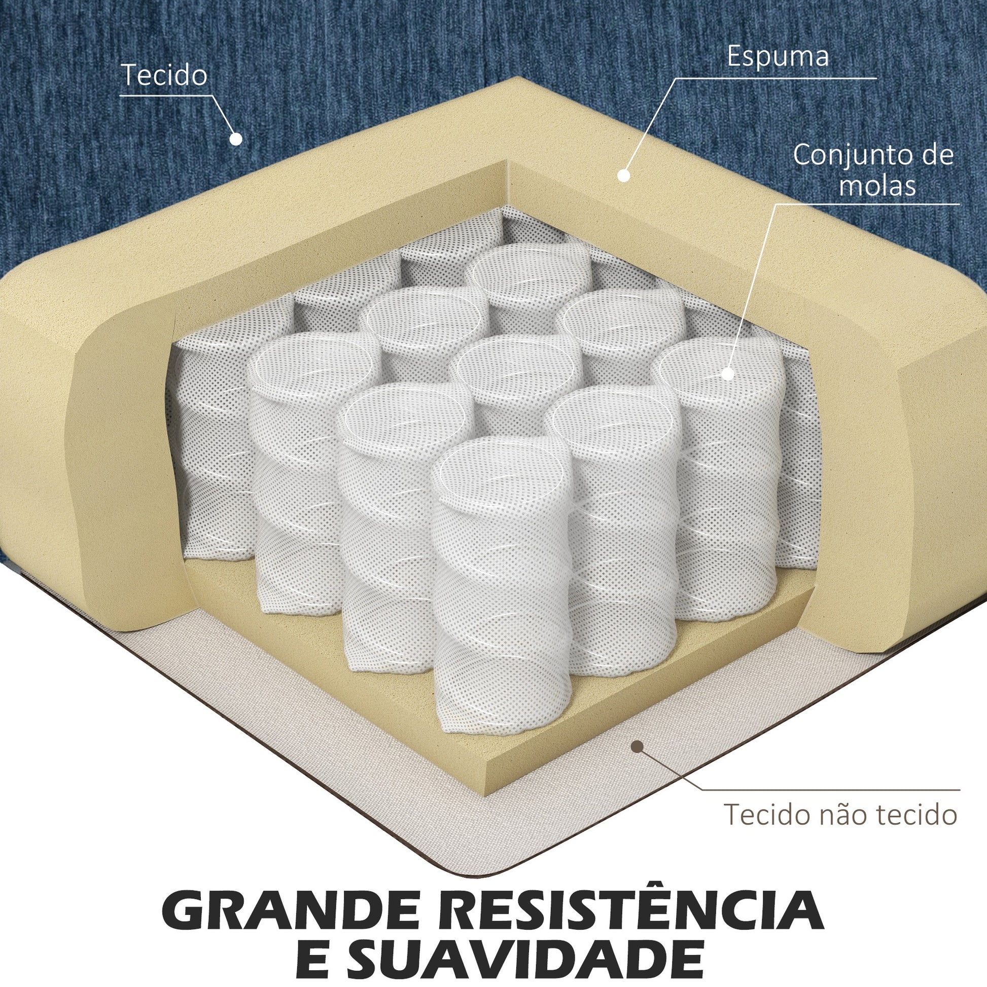 - Benefícios: O sofá proporciona suavidade, resistência e suporte. As almofadas de assento e encosto acolchoadas com 15 cm de espessura de alta densidade garantem máximo conforto.