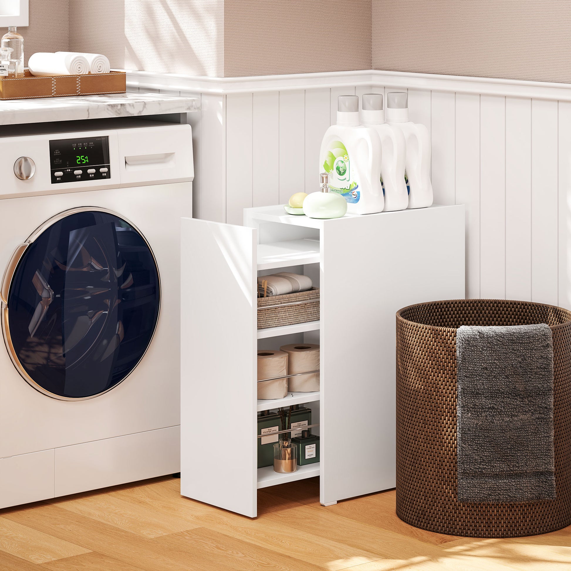 Organize a sua casa de banho com este móvel estreito e prático, ideal para espaços reduzidos.